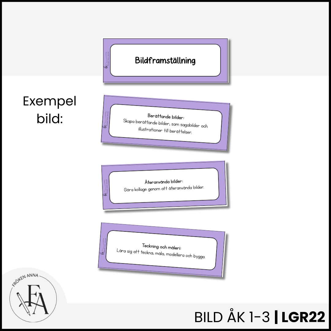 Synliggör det centrala innehållet på ett elevnära språk. I detta paket ingår hela det centrala innehållet för ämnet bild för årskurs 1-3. Varje delmoment finns på ett eget kort, perfekt att sätta upp på tavlan när ni arbetar med de olika områdena. Använd detta material för att tydliggöra och visualisera Lgr22.