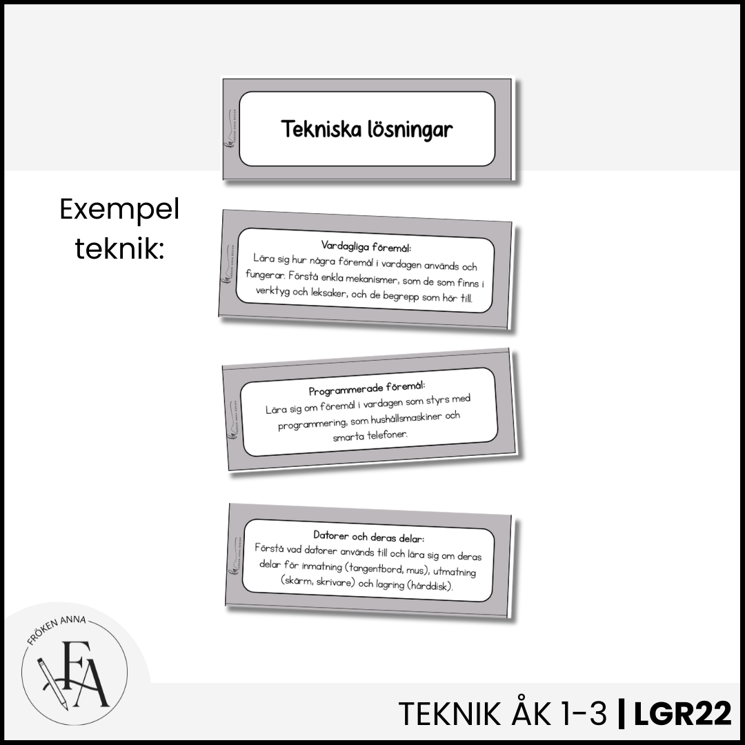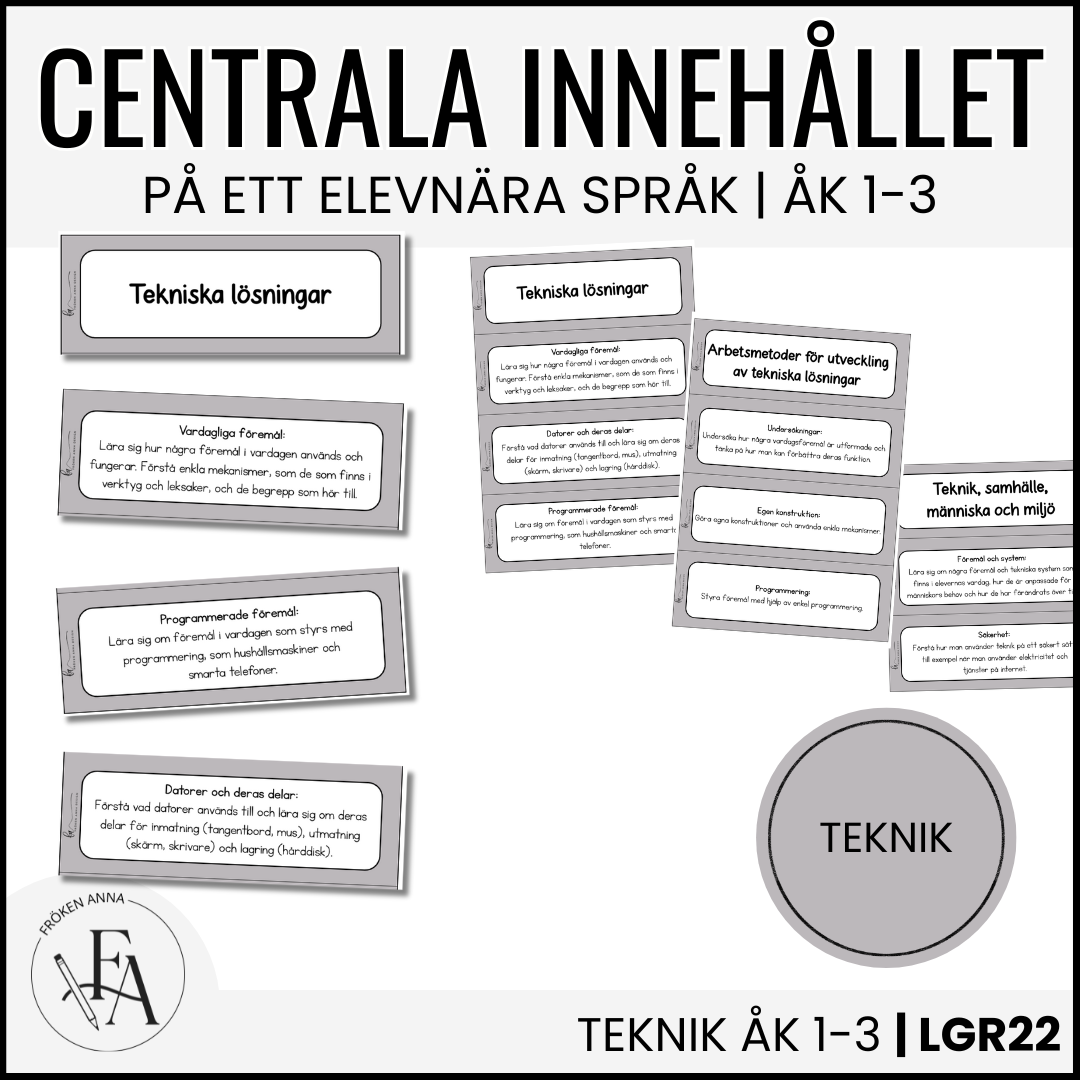 Synliggör det centrala innehållet på ett elevnära språk. I detta paket ingår hela det centrala innehållet för ämnet teknik för årskurs 1-3. Varje delmoment finns på ett eget kort, perfekt att sätta upp på tavlan när ni arbetar med de olika områdena. Använd detta material för att tydliggöra och visualisera Lgr22.