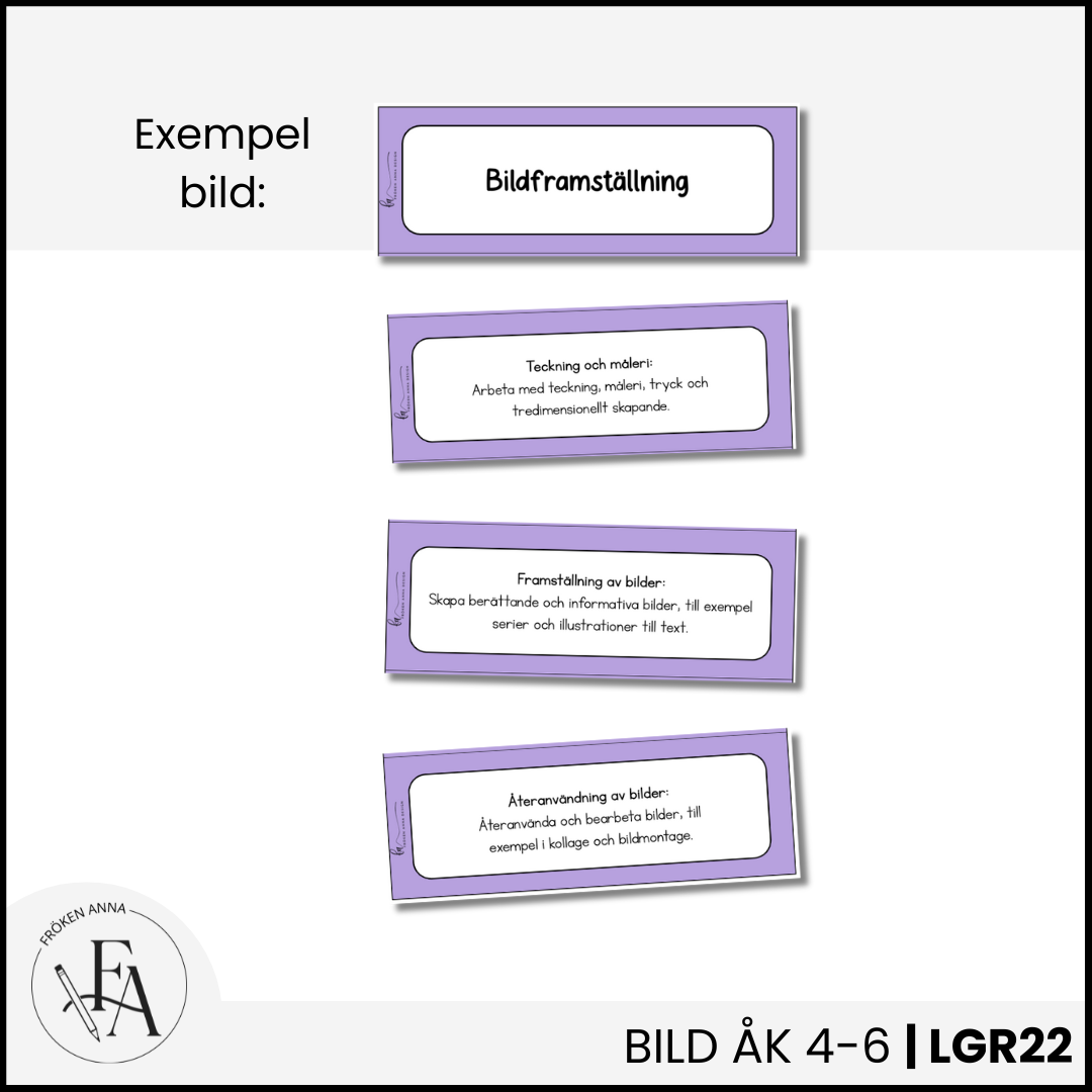 Synliggör det centrala innehållet på ett elevnära språk. I detta paket ingår hela det centrala innehållet för ämnet bild för årskurs 4-6. Varje delmoment finns på ett eget kort, perfekt att sätta upp på tavlan när ni arbetar med de olika områdena. Använd detta material för att tydliggöra och visualisera Lgr22.