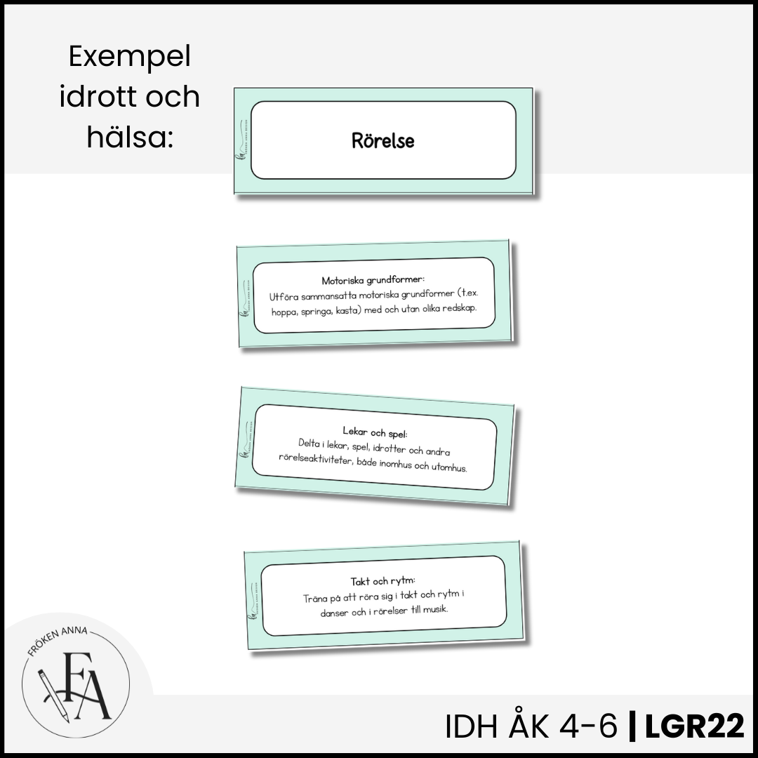 Synliggör det centrala innehållet på ett elevnära språk. I detta paket ingår hela det centrala innehållet för ämnet idrott och hälsa för årskurs 4-6. Varje delmoment finns på ett eget kort, perfekt att sätta upp på tavlan när ni arbetar med de olika områdena. Använd detta material för att tydliggöra och visualisera Lgr22.