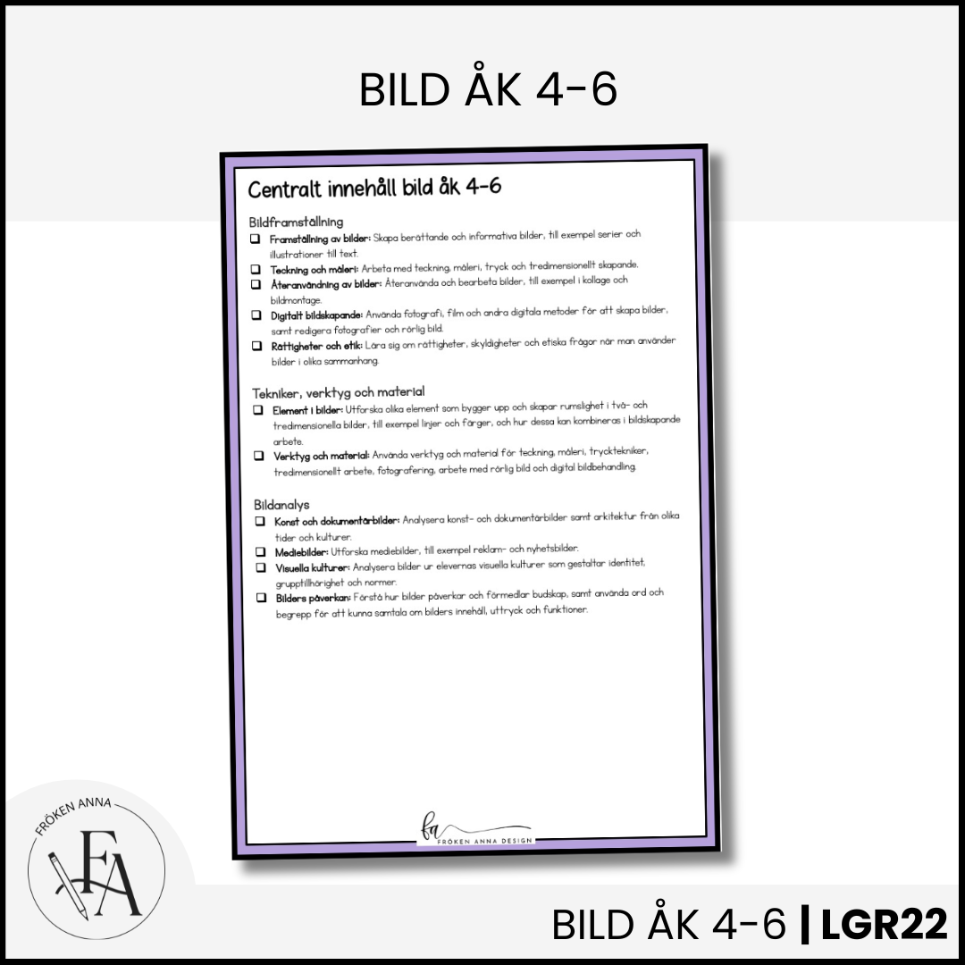 Checklista över det centrala innehållet i ämnet bild för åk 4-6, skrivet på ett elevnära och förenklat språk. Använd som underlag för varje elev vid IUP-samtal eller vid din egen planering av ämnet så inget missas.