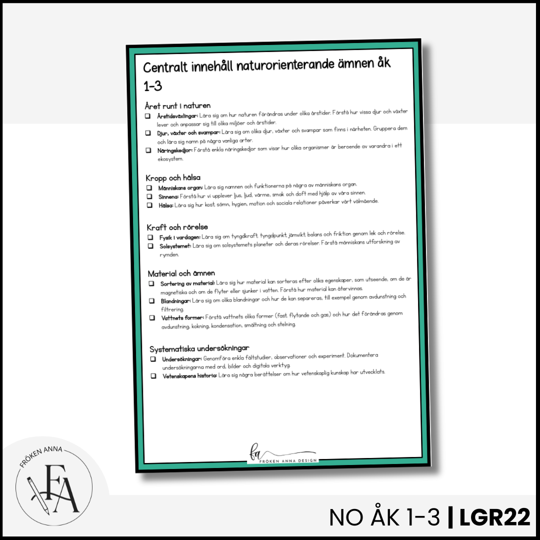 Checklista över det centrala innehållet i ämnet NO för åk 1-3, skrivet på ett elevnära och förenklat språk. Använd som underlag för varje elev vid IUP-samtal eller vid din egen planering av ämnet så inget missas.
