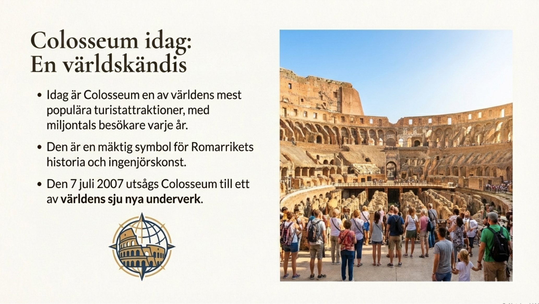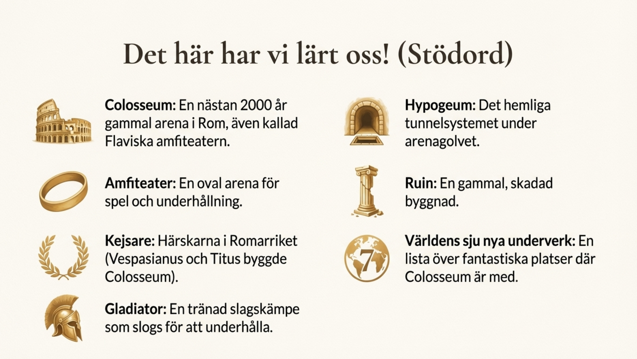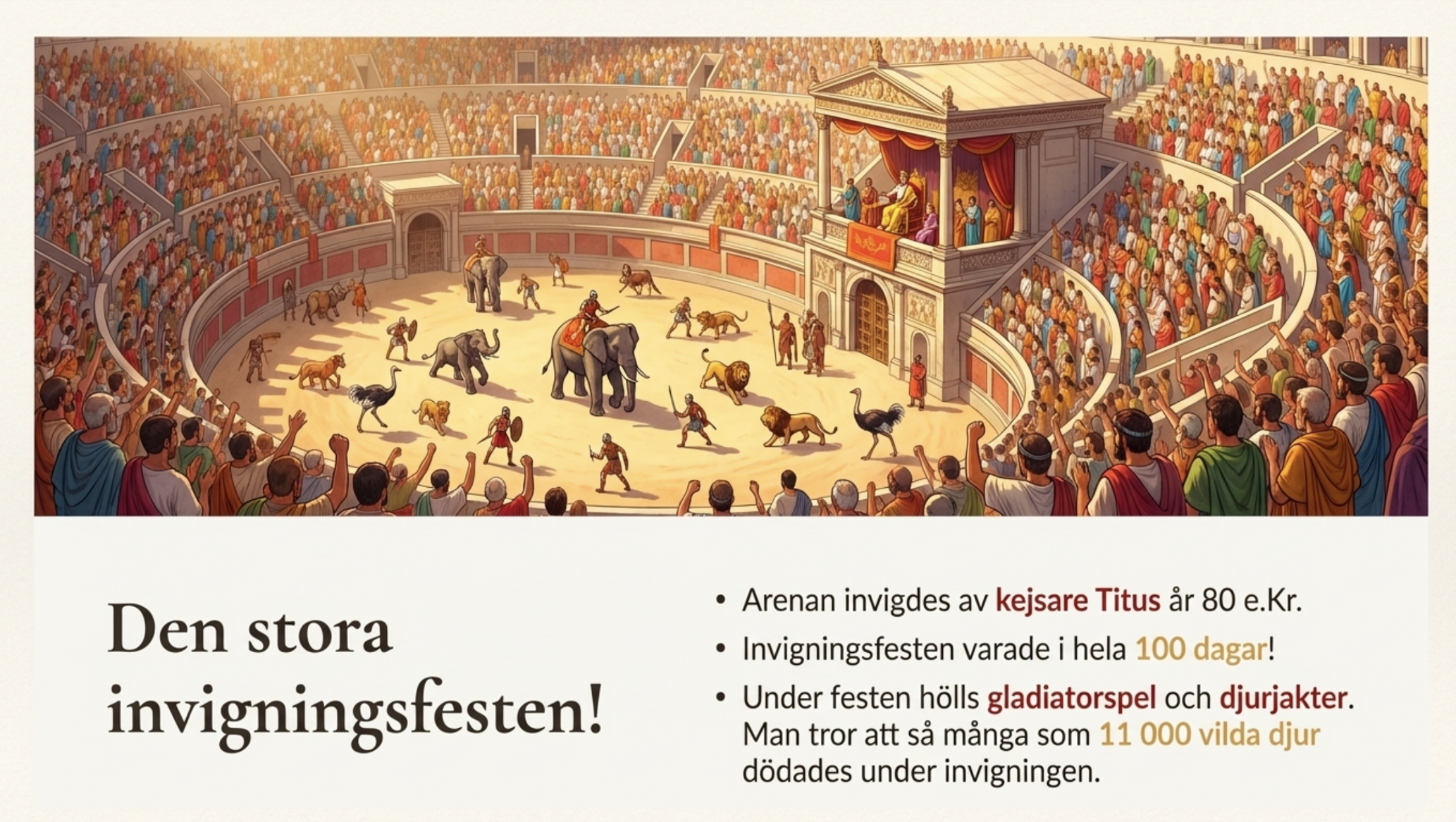 Colosseum är en enorm amfiteater i Rom som under romarriket användes för storslagna underhållningsspel, främst gladiatorspel och djurstrider. Den imponerande stenbyggnaden kunde rymma upp till 80 000 åskådare som satt placerade efter sin sociala rang i samhället. Under arenans golv fanns ett komplext system av tunnlar och hissar som användes för att snabbt få upp krigare och vilda djur till publikens jubel. Idag är Colosseum ett av världens mest kända arkitektoniska mästerverk och står kvar som en kraftfull symbol för det romerska imperiets makt och ingenjörskonst.