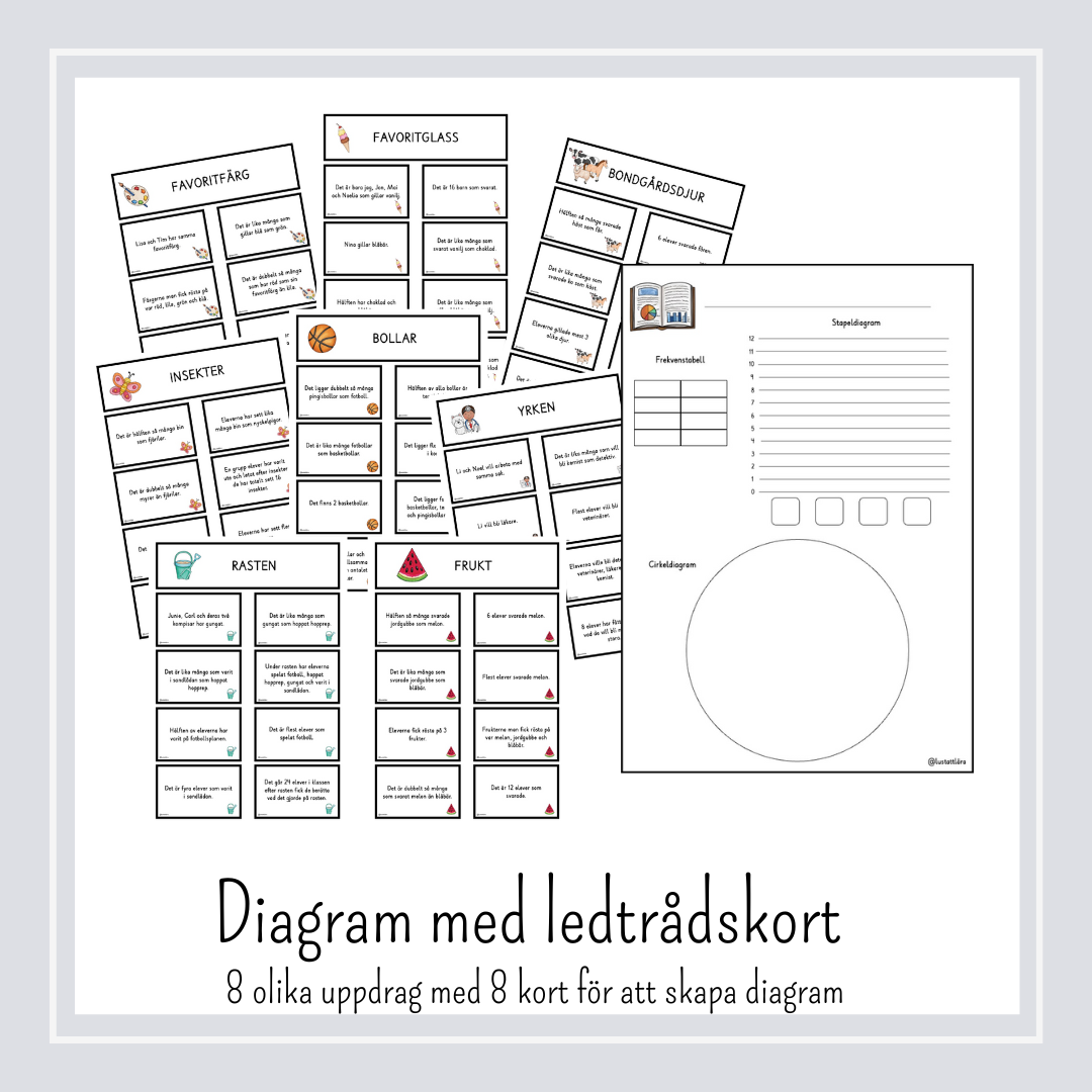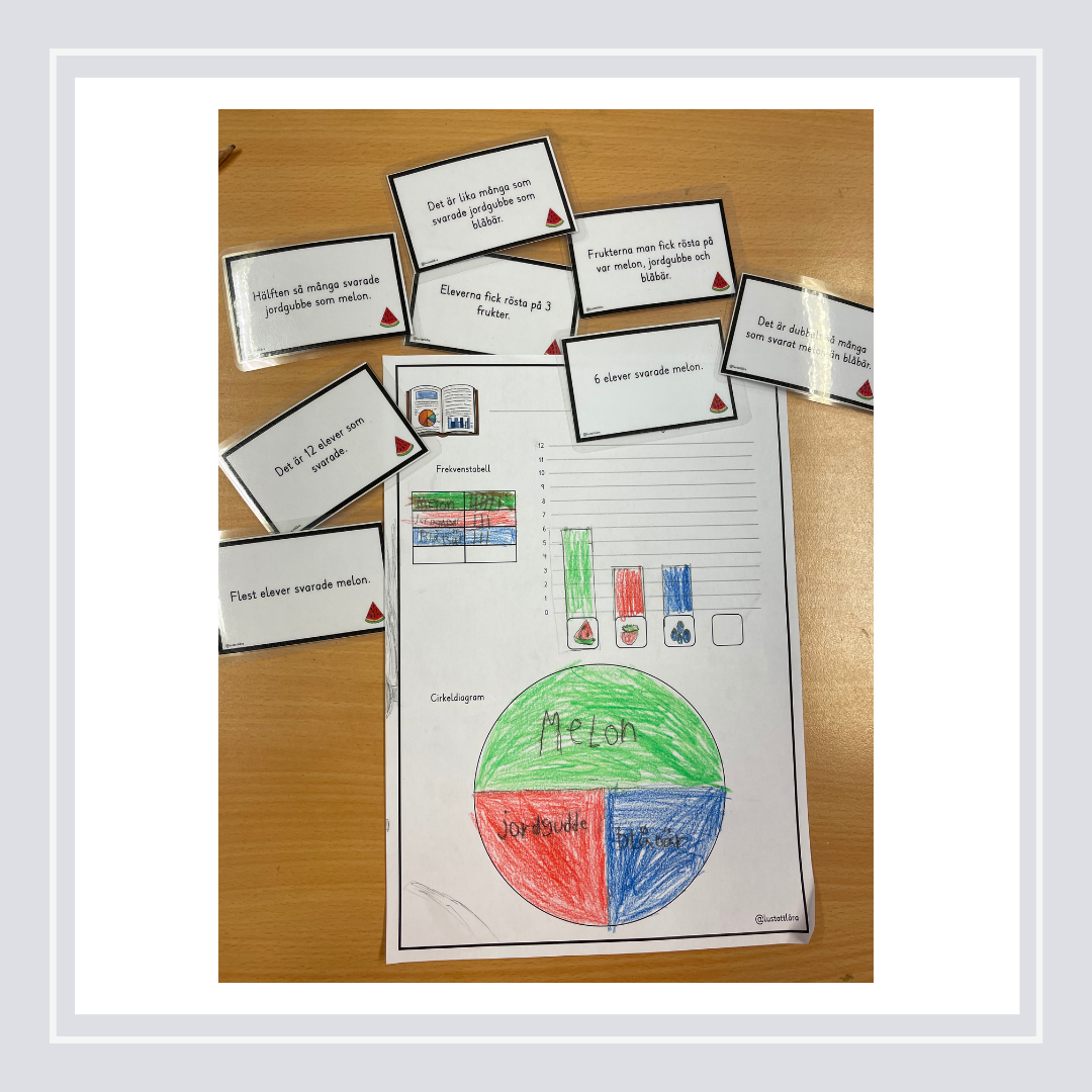 8 olika uppdrag där varje uppdrag består utav 8 kort. För att kunna fylla i all statistik måste men läsa alla kort och klura ut vilket kort som ger vilken information så man kan fylla i en frekvenstabell. När frekvenstabellen är ifylld så kan man gå vidare till att skapa ett stapeldiagram och ett cirkeldiagram.