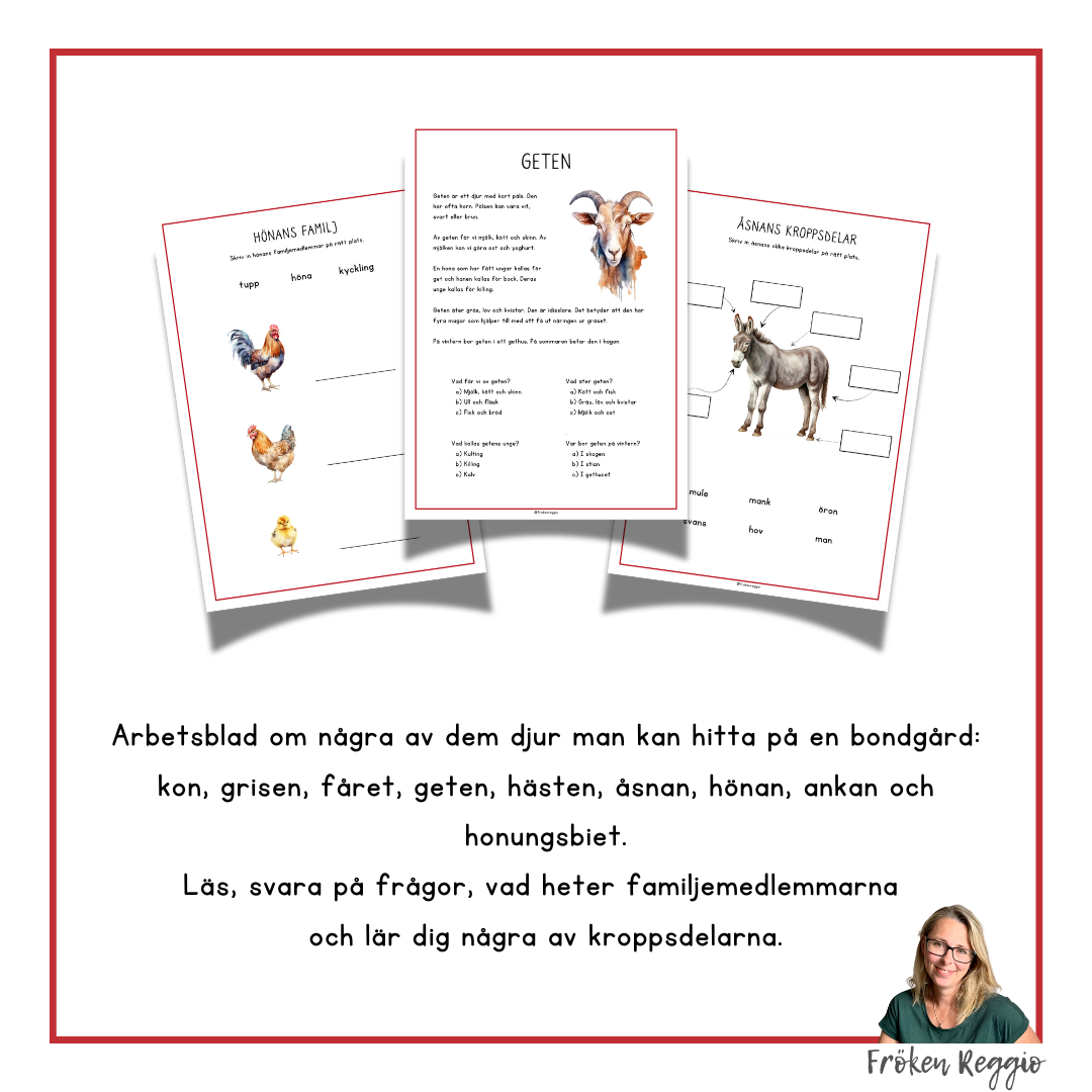 Arbetsblad om några av dem djur man kan hitta på en bondgård: kon, grisen, fåret, geten, hästen, åsnan, hönan, ankan och honungsbiet. Läs, svara på frågor, vad heter familjemedlemmarna och lär dig några av kroppsdelarna.