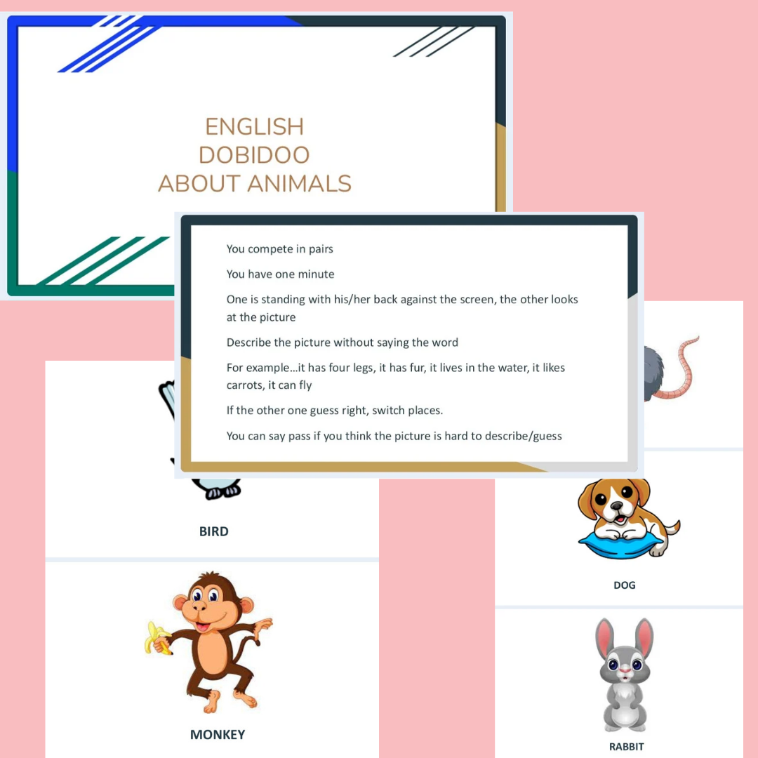 Materialet innehåller instruktioner och bilder på 60 olika djur. Man behöver en timer för att ta tiden, en skärm där den ena eleven ser bilden (den andra eleven står med ryggen emot skärmen). En rolig övning där eleverna lär sig att beskriva. Formen är tagen från programmet Dobidoo, där de har något som heter ”Sista minuten”. Elever ska i par beskriva så många djur de kan på en minut. Instruktioner finns i materialet.