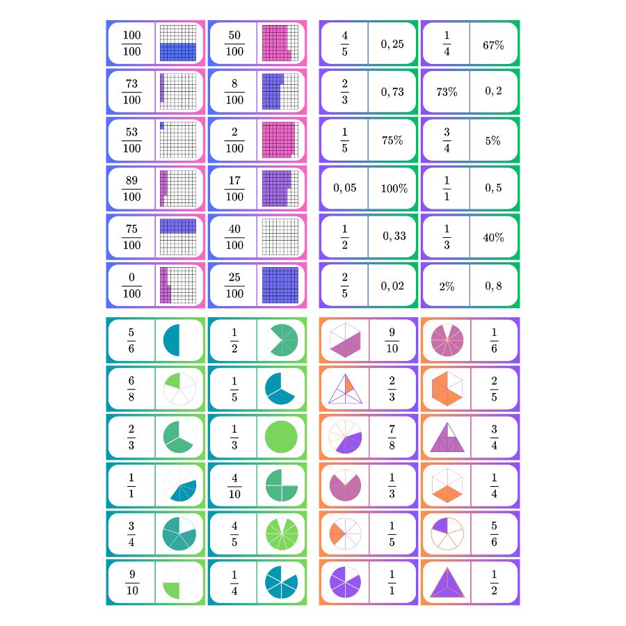 Dominokort att skriva ut och laminera där eleverna får träna på sambandet mellan bråk-, procent- och decimalform. Materialet innehåller 7 ark med 12 dominor i vardera. Arken har nedanstående ”tema”: