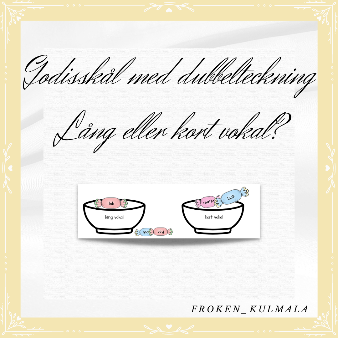 Sortera karamellerna i godisskålar utifrån om ordet har en lång eller kort vokal. Låt eleverna på ett praktiskt sätt sortera ord med dubbelteckning. PDF-fil bestående av två godisskålar med 54 ord. Eleven läser orden och funderar över om ordet har en lång vokal eller kort. Sedan lägger eleven ordet i den skål som ordet passar bäst i.