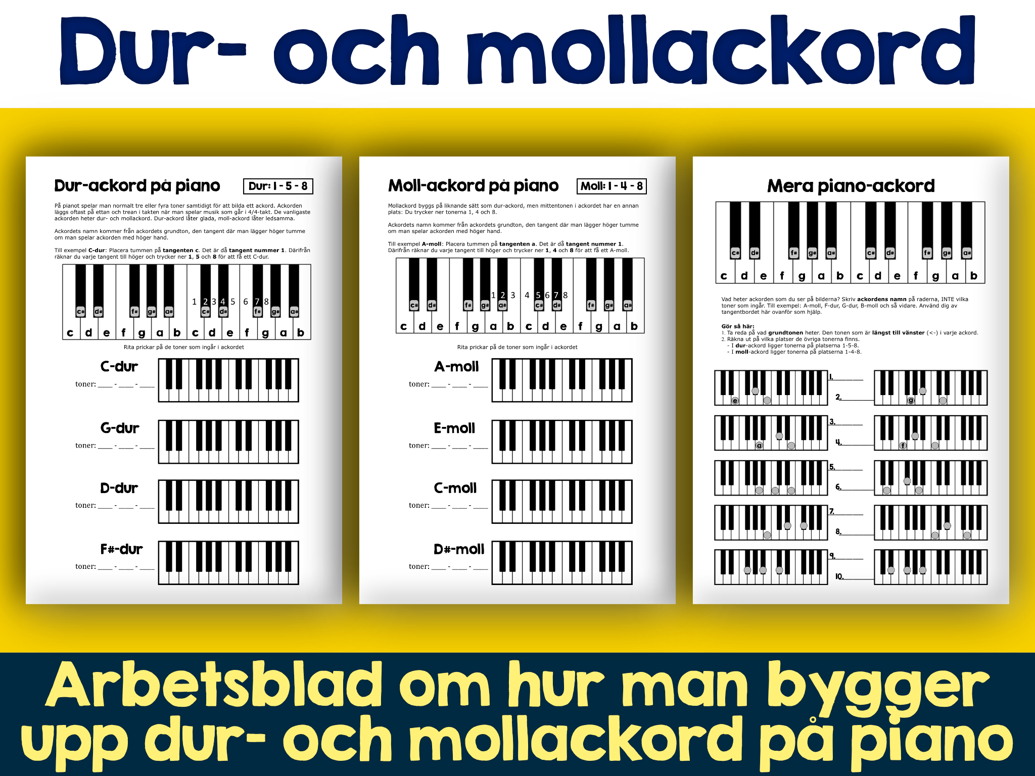 De här pianobladen är utformade för att göra det enkelt och roligt att lära sig ackord! Med fokus på grundläggande dur- och mollackord finns här tydliga, steg-för-steg-instruktioner för hur man spelar varje typ av ackord. Oavsett om eleverna är nybörjare eller har viss erfarenhet kan man använda de här arbetsbladen för att öva på att bygga ackord utan att kunna avancerad musikteori.