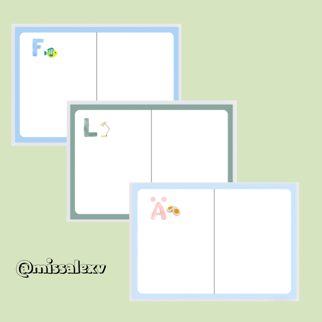Materialet lämpar sig bäst till förskoleklass. Det är ett häfte som innehåller 29 sidor, där varje sida är uppdeld i två kolumner. I den vänstra kolumnen ska eleverna skriva exempelvis 10 ord som börjar på den bokstav som finns på sidan och på den högra kolumnen ska eleverna rita några av de ord som dom skrivit i den vänstra kolumnen.