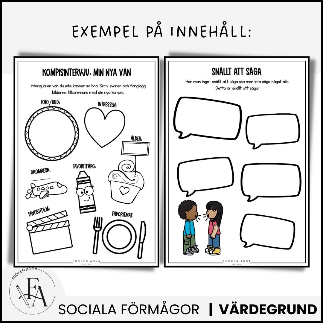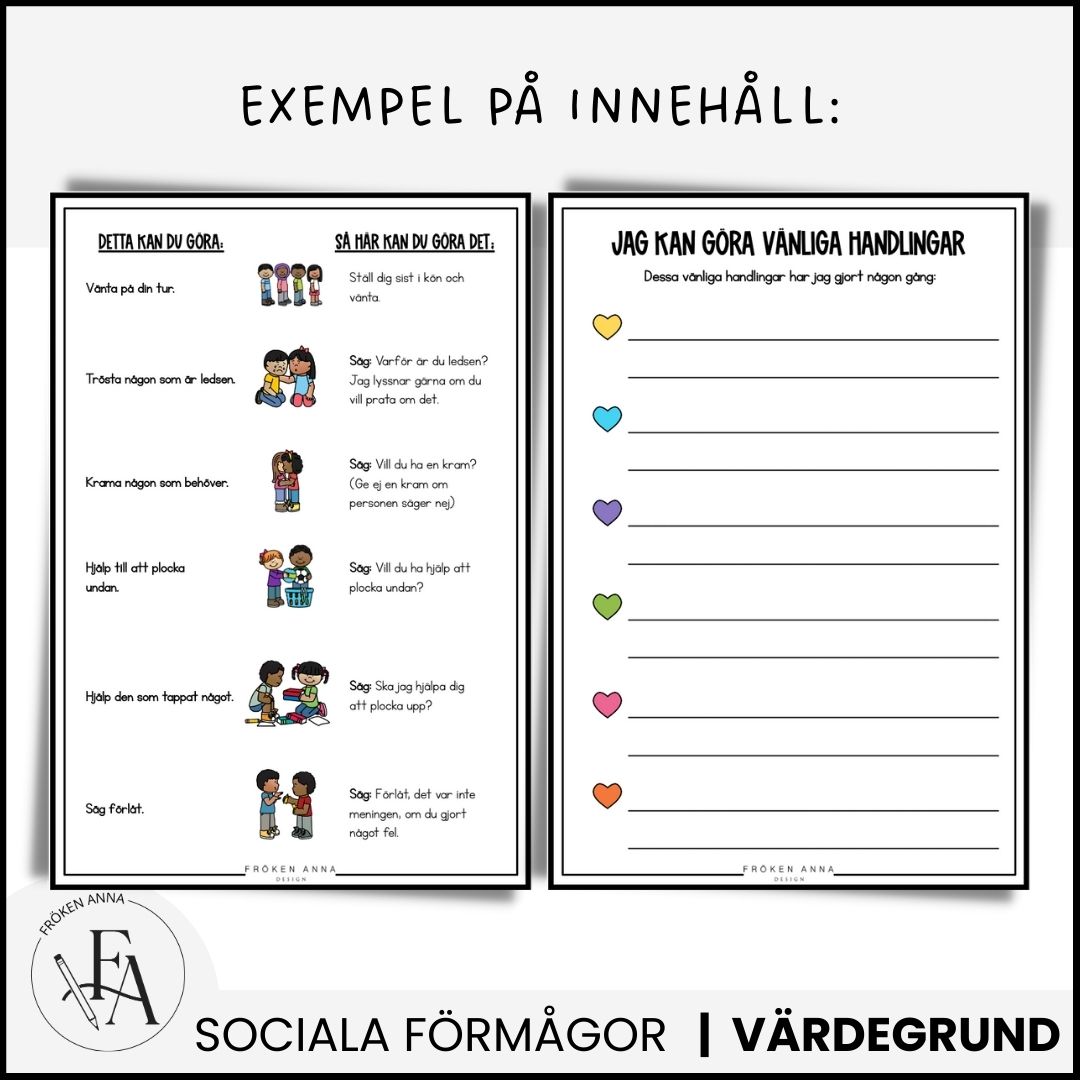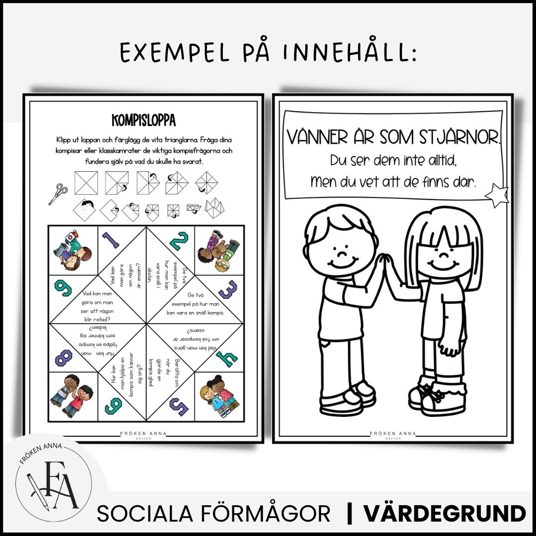 I detta arbetshäfte får eleverna läsa, lära,  skriva och samtala om hur man är en bra kompis och vad man kan göra i konkret handling. Häftet består av totalt 18 sidor:
