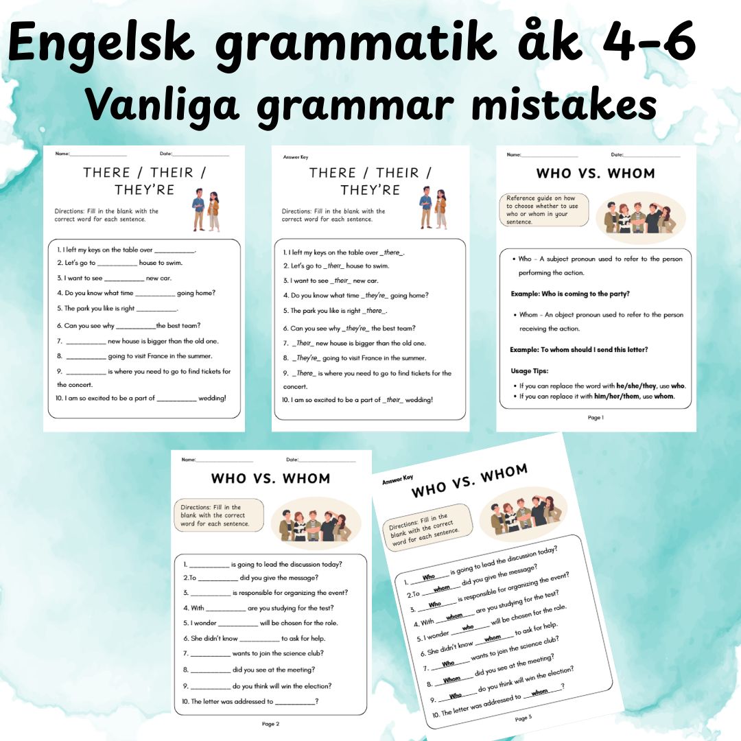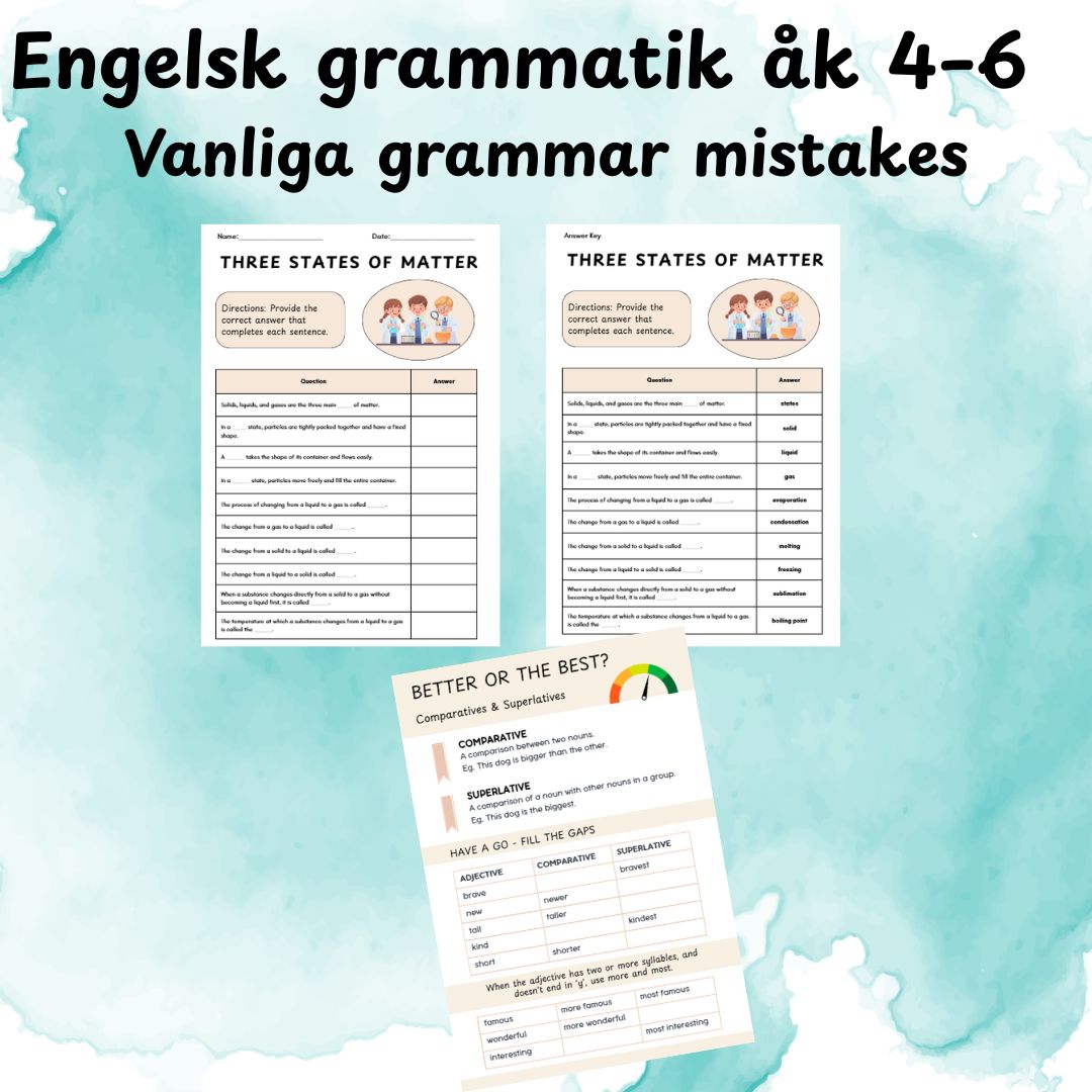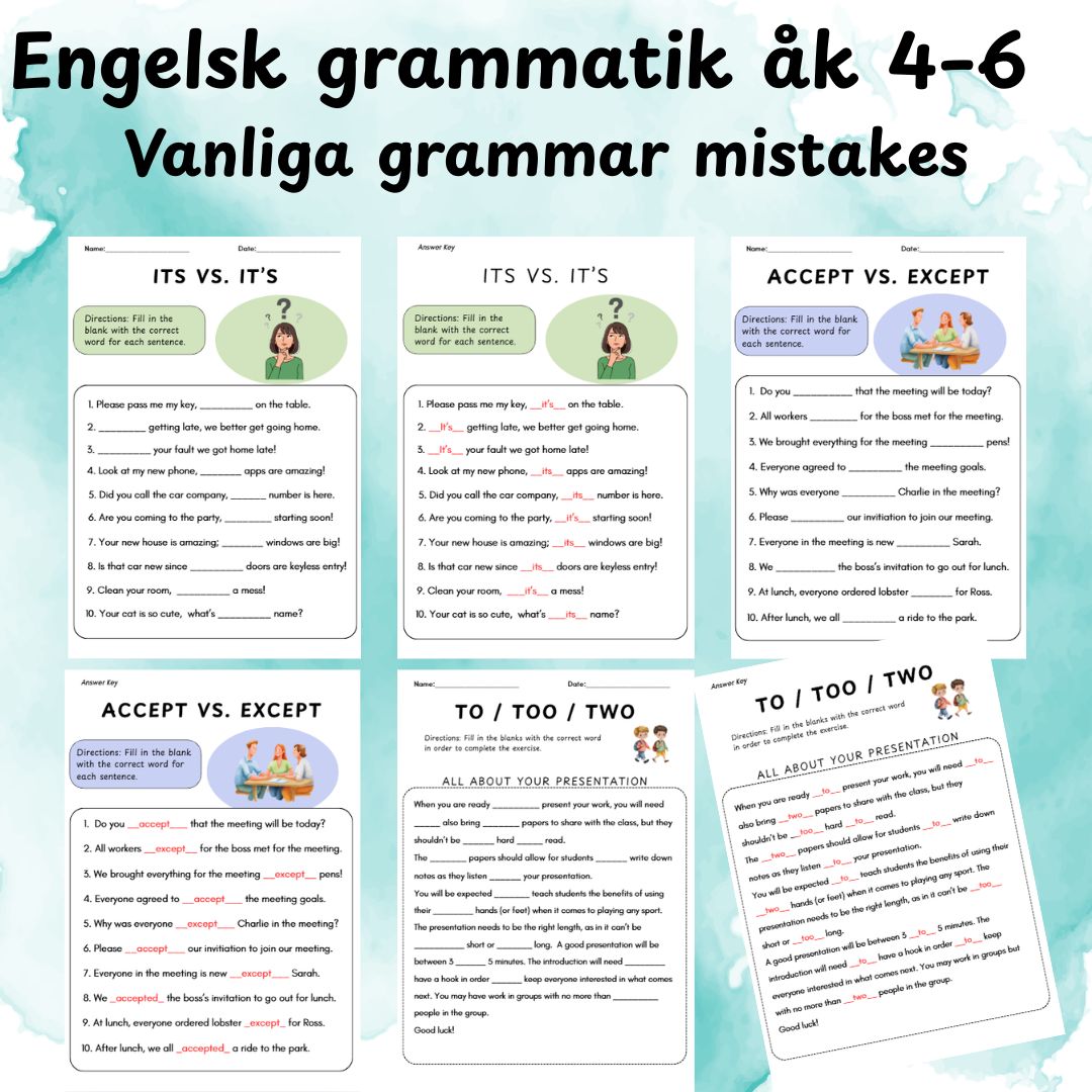 Detta grammatikhäfte i engelska är anpassat för åk 4–6 och innehåller 20 sidor med varierade övningar och facit.