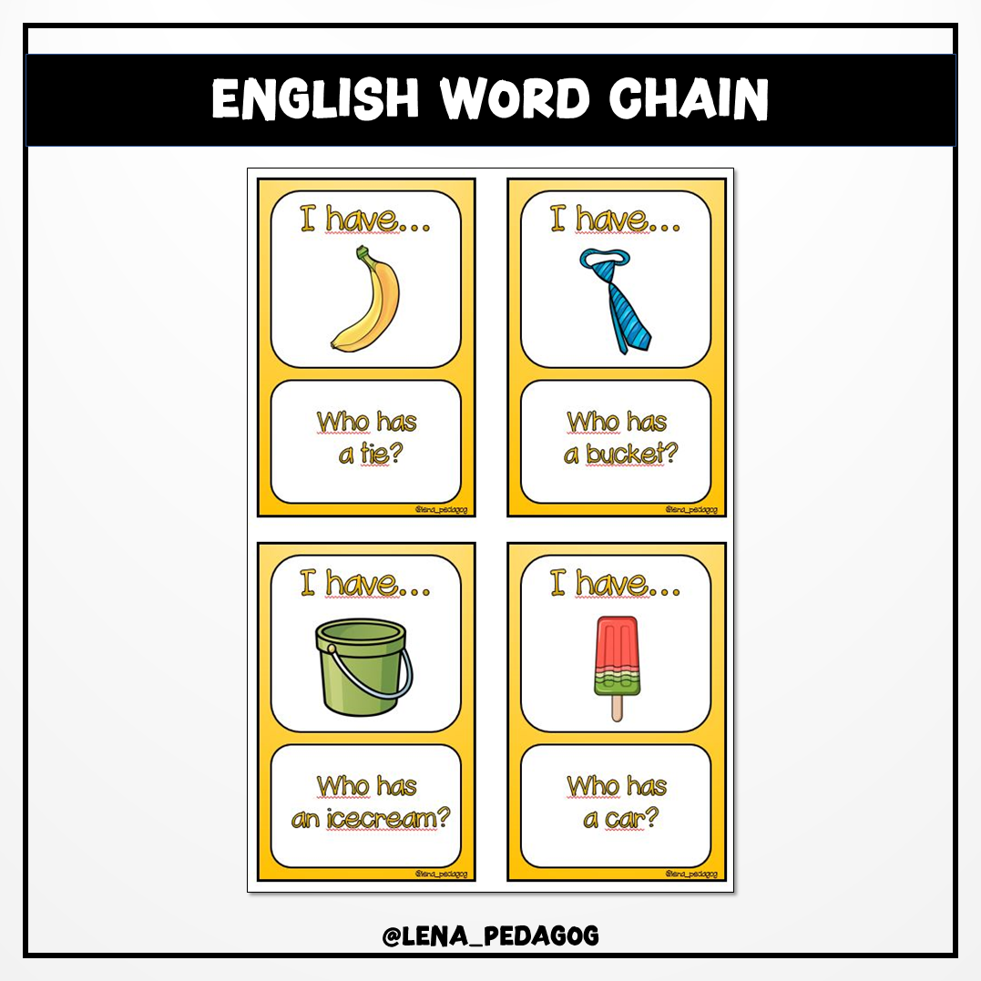 68 bilder i en lång ordkedja på engelska. OBS! Det finns inget start- eller stoppkort, utan hela kedjan ska användas.