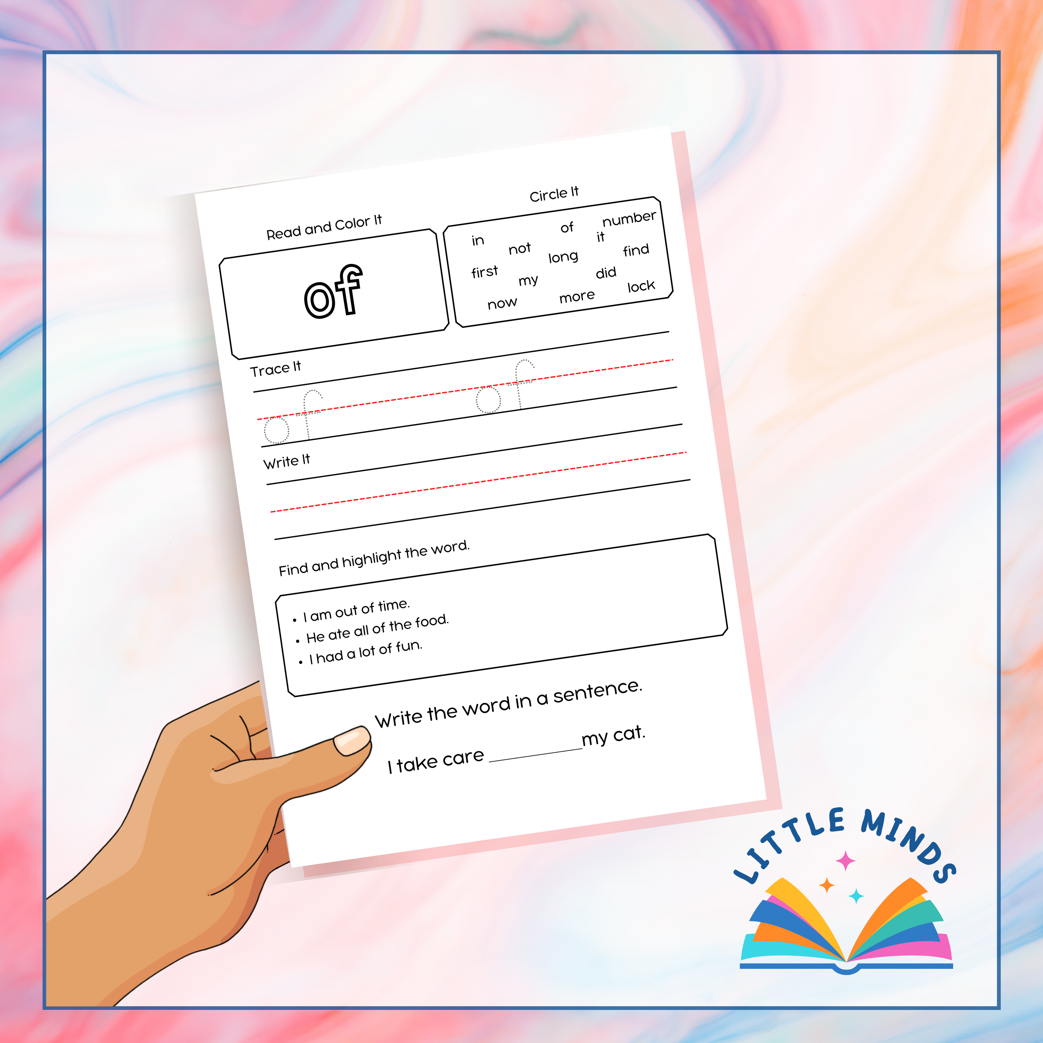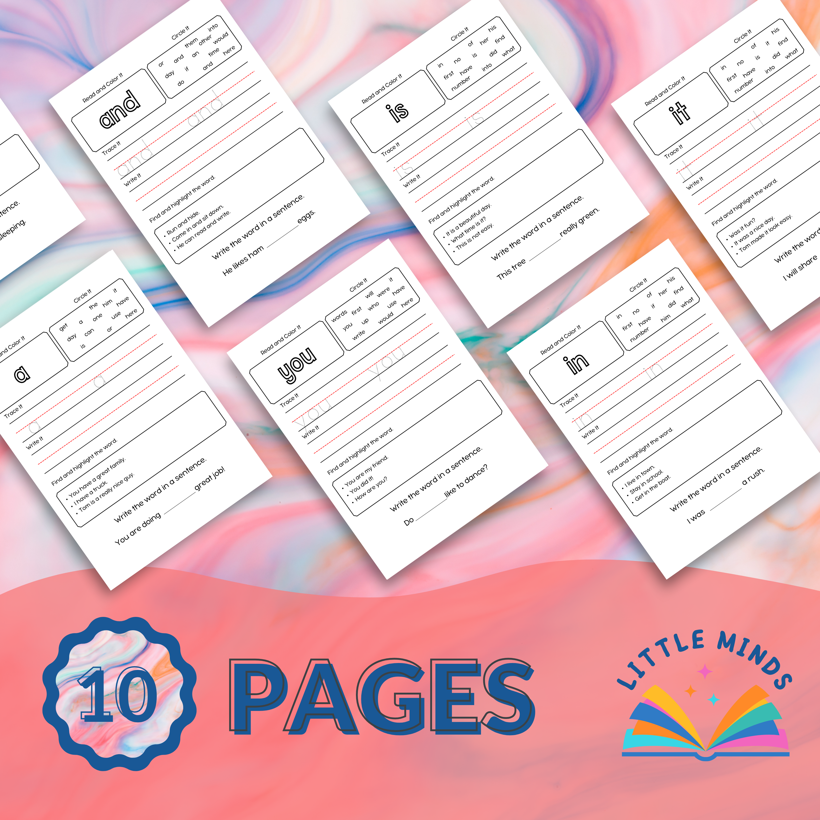 In this worksheet your class can read and color sight words, circle, trace and write them. Find the words in a sentence and write the words in a sentence. The words included in this worksheet are: a, and, in, is, it, of, that, the, to, you.