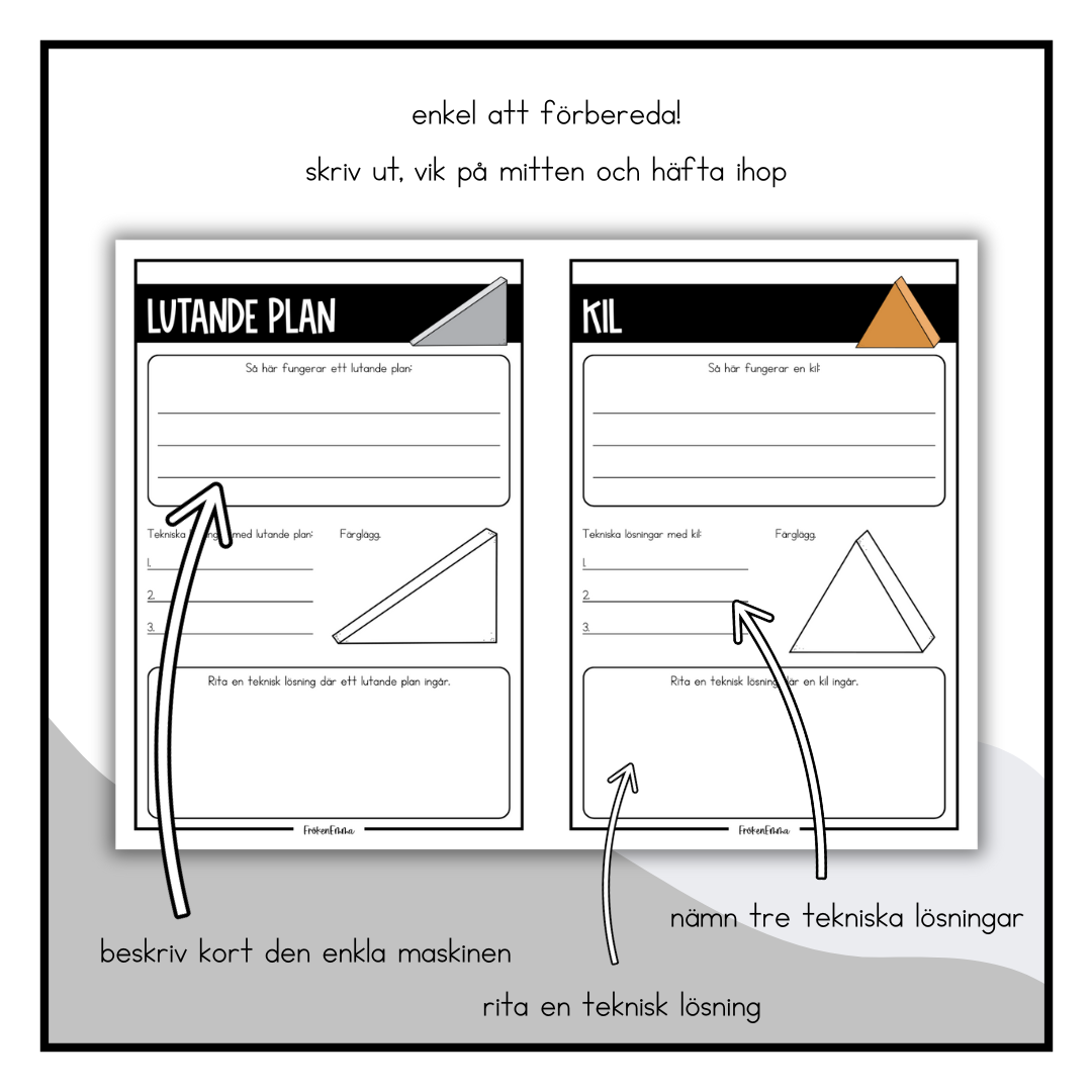 Min gamla "Min bok om enkla maskiner" har fått en uppdatering som är betydligt lättare att använda. Denna bok om de sex enkla maskinerna är enkel att förbereda till eleverna. Skriv ut, vik på mitten och häfta ihop! I denna bok får eleverna skriva och befästa sina kunskaper om de sex enkla maskinerna: hjulet, hävstången, lutande planet, kilen, skruven och blocket/taljan. I boken kan eleven skriva kort om varje enkel maskin, nämna tre tekniska lösningar som innehåller den enkla maskinen, rita en teknisk lösning med den enkla maskinen samt färglägga. Alla sidor ser likadana ut för alla enkla maskiner vilket gör den lätt för eleverna att använda. Baksidan av boken repeterar även de enkla maskinerna.