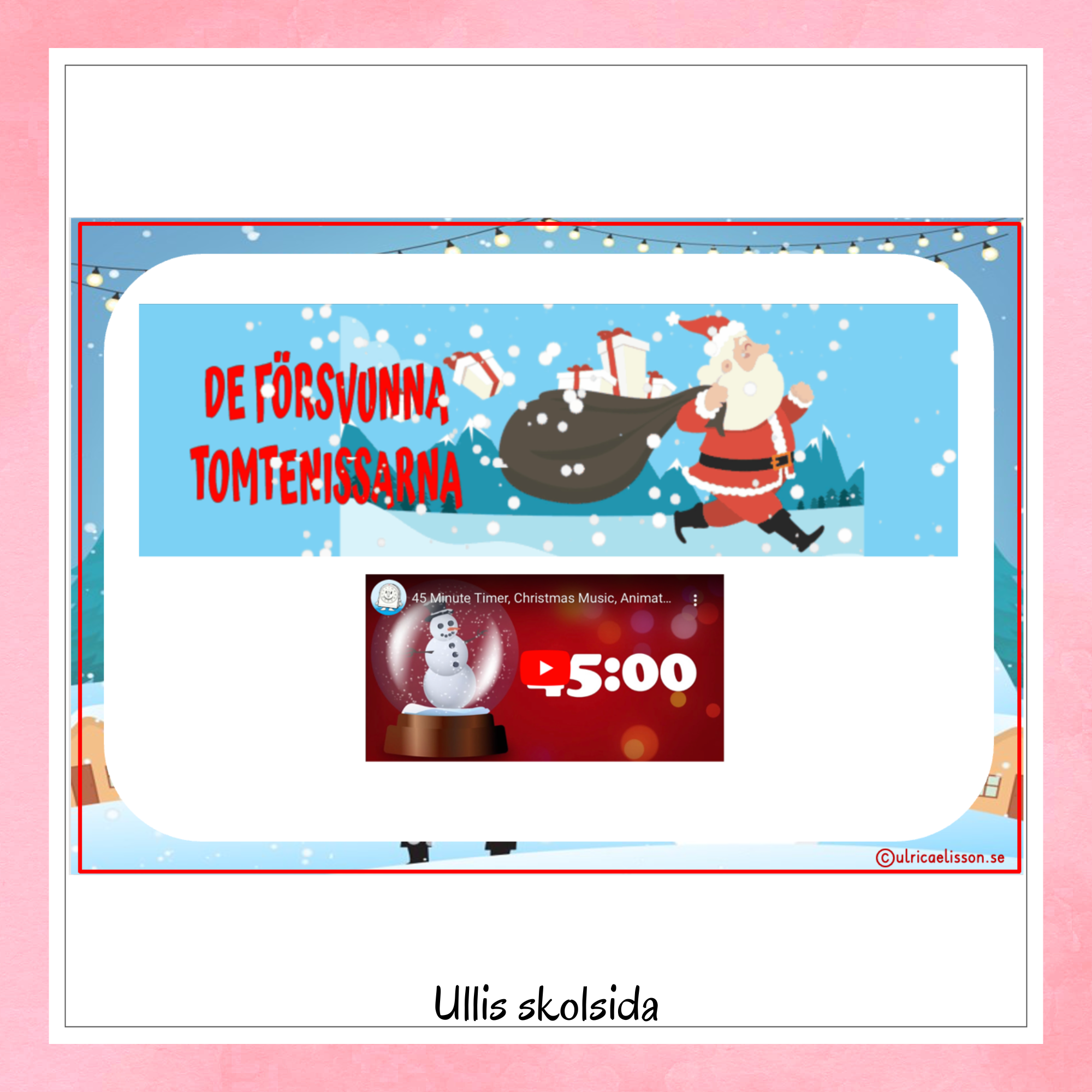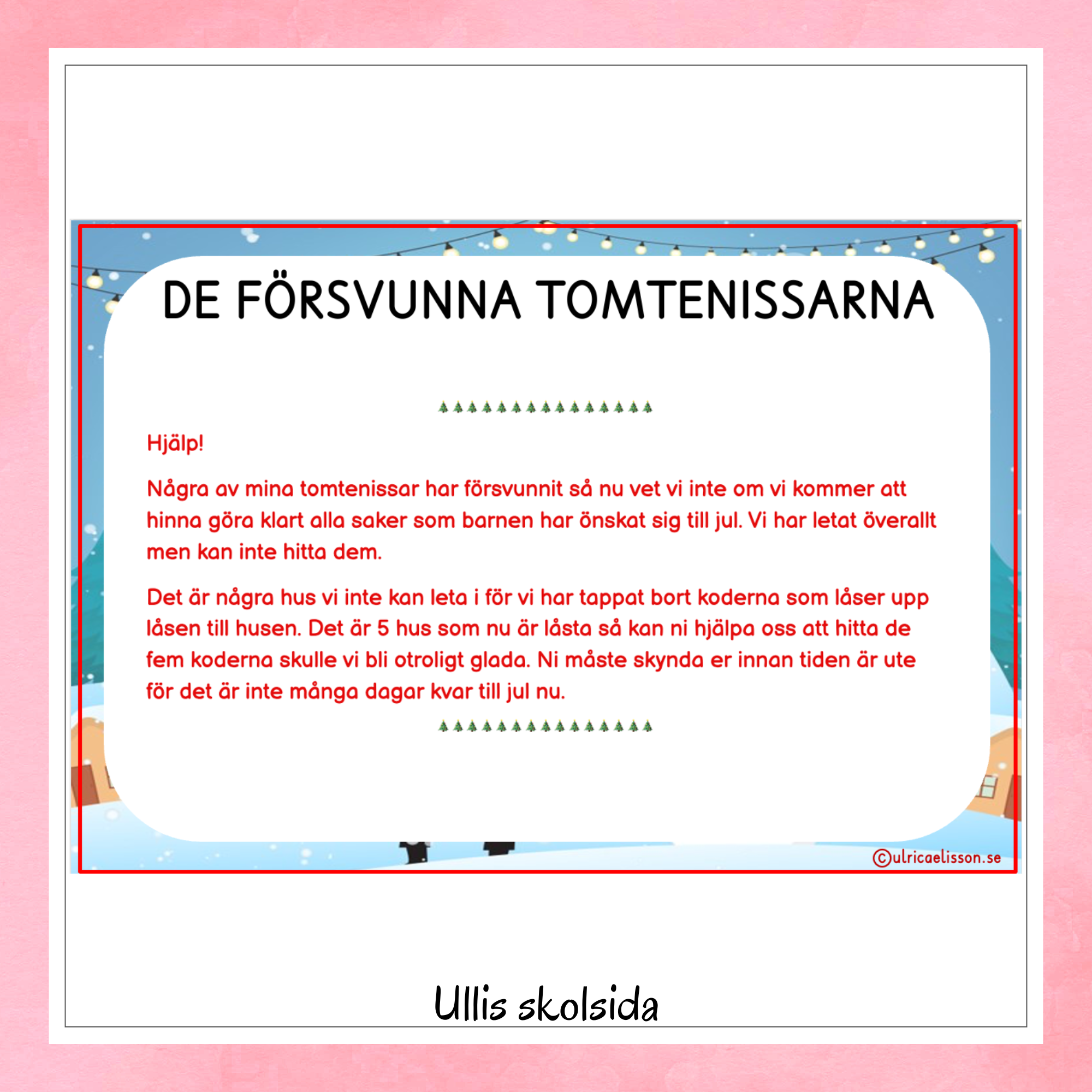 I detta Escape room, finns det 5 uppgifter som man måste lösa för att hitta delar för att låsa upp de fem låsen. Sedan får man ett slutuppdrag där man ska ta reda på vad det står i det hemliga meddelandet. Ett digitalt Escape room är en interaktiv aktivitet där grupper med 3-4 elever eller par använder ledtrådar för att lösa utmaningar och låsa upp digitala lås. Upplägget är tänkt att användas i åk 3-6 men går att använda även i andra åldrar. I upplägget ”Escape room – De försvunna tomtenissarna” har några av tomtens nissar försvunnit så de har svårt att hinna göra klart alla julklappar till jul. De har letat överallt men i fem hus kan de inte komma in då de inte har koderna till låsen. Ett digitalt Escape room använder samma koncept  som ett fysiskt Escape room, men i stället för att låsa upp ett lås eller en låda fysiskt, kommer eleverna att ange koder i Google Formulär. Eleverna behöver tillgång till internet. De kan använda en PC, Mac, Chromebook eller surfplatta. Varken du eller eleverna behöver ett Google konto för att kunna genomföra detta. Eleverna kommer inte att komma vidare om de inte skriver in rätt svar. OBS! Får du problem med länken som finns med i detta escape room, prova att ladda ner materialet igen för att få en ny länk då jag uppdaterat materialet. Hör av dig till mig info@ulricaelisson.se om det ändå inte fungerar.