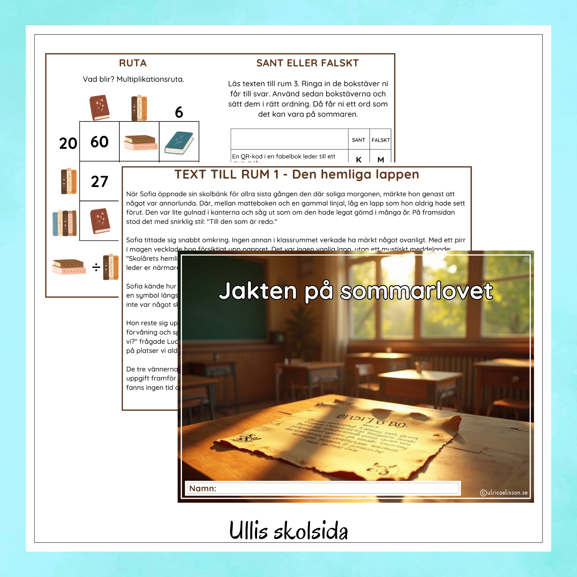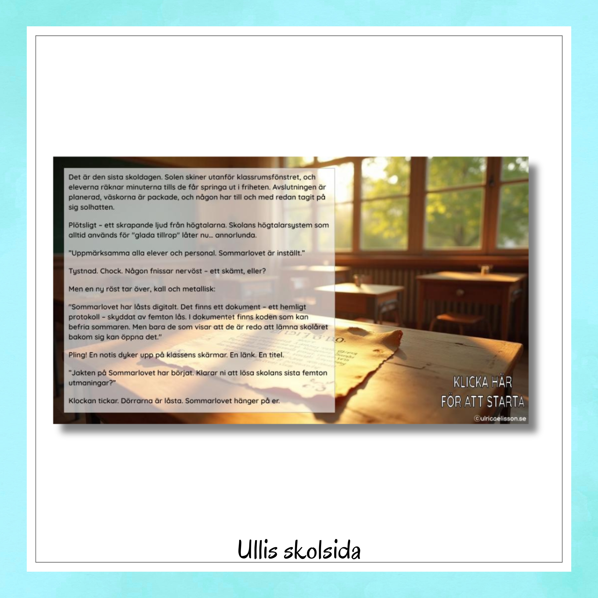 När samtliga femton uppgifter är lösta, och eleverna har tagit sig genom alla tre rum, låses det digitala sommarlovsdokumentet upp – och sommarlovet är räddat!