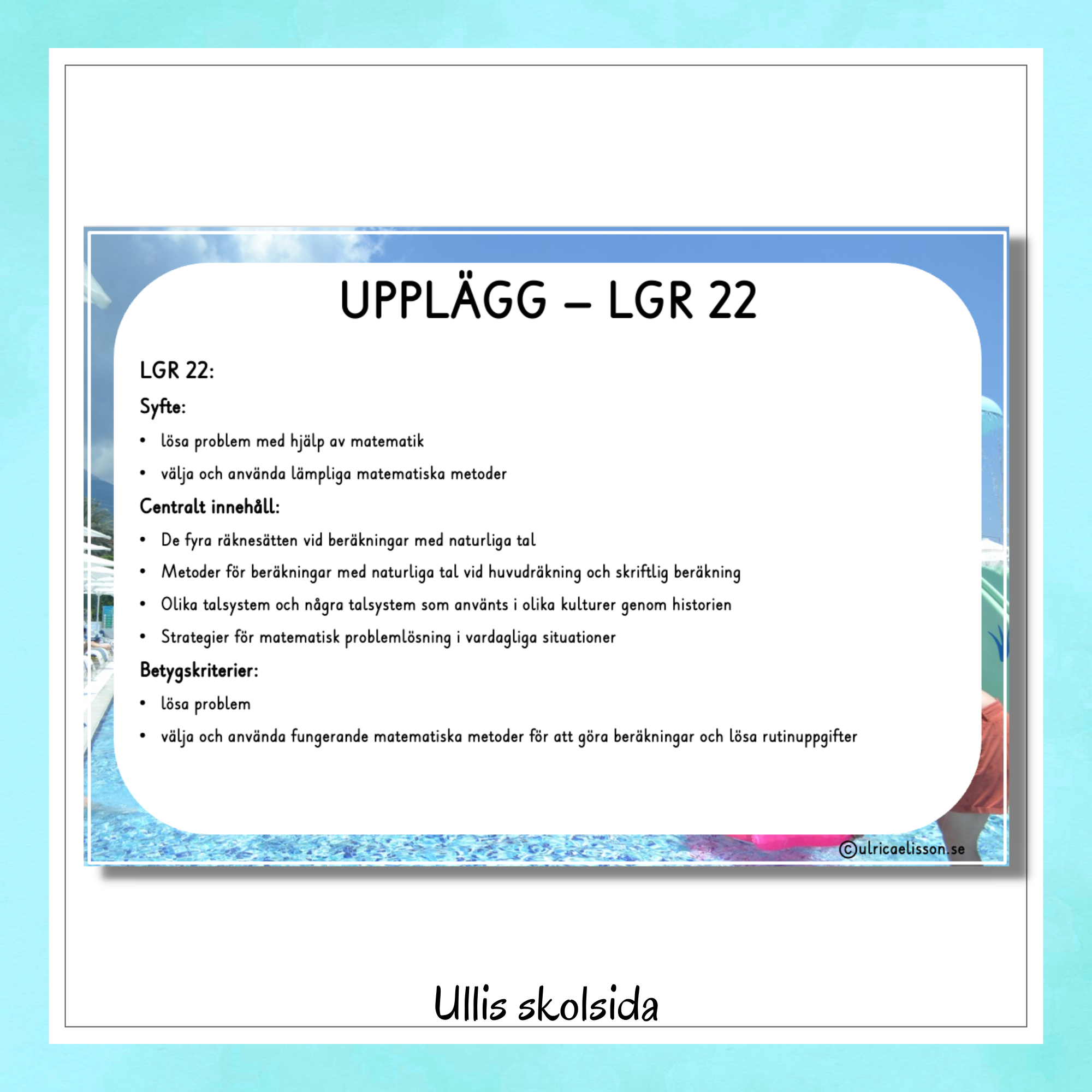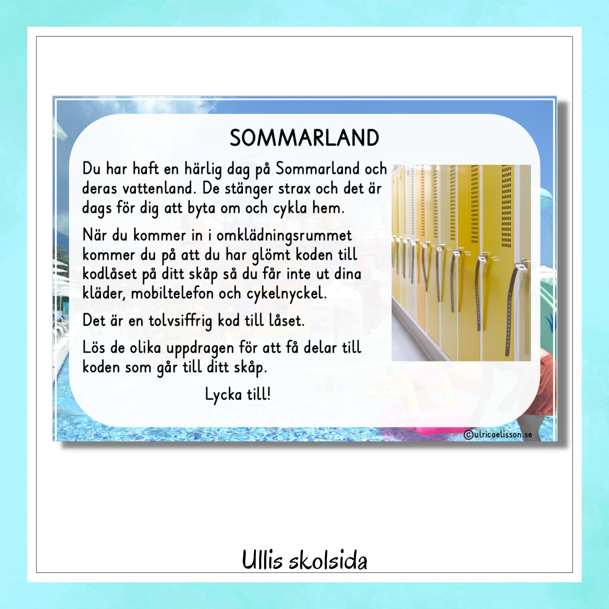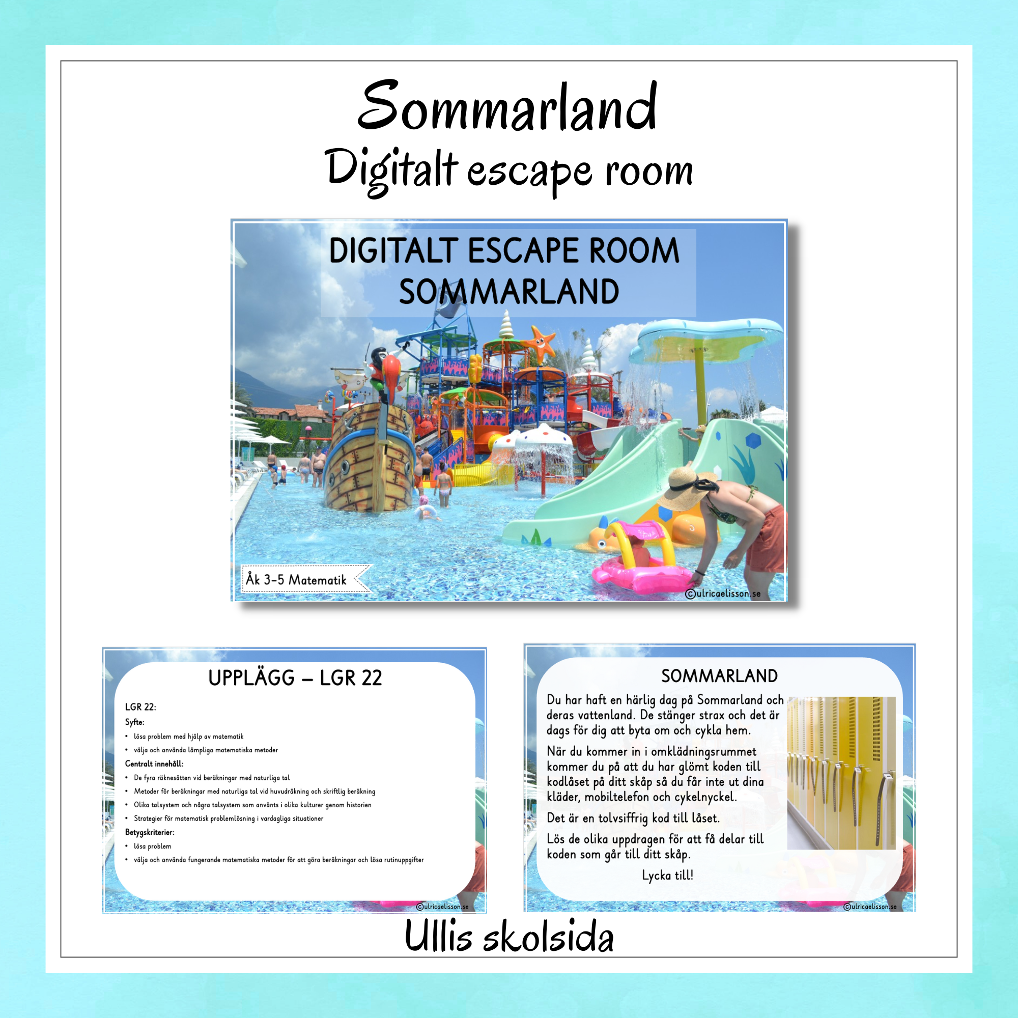 I upplägget ”Escape room – Sommarland” har du varit på Sommarland en heldag och upptäcker när du kommer till ditt skåp i omklädningsrummet att du har glömt koden till skåpets kodlås. Dessa aktiviteter består av att lösa både matematikuppgifter och olika pussel/utmaningar.