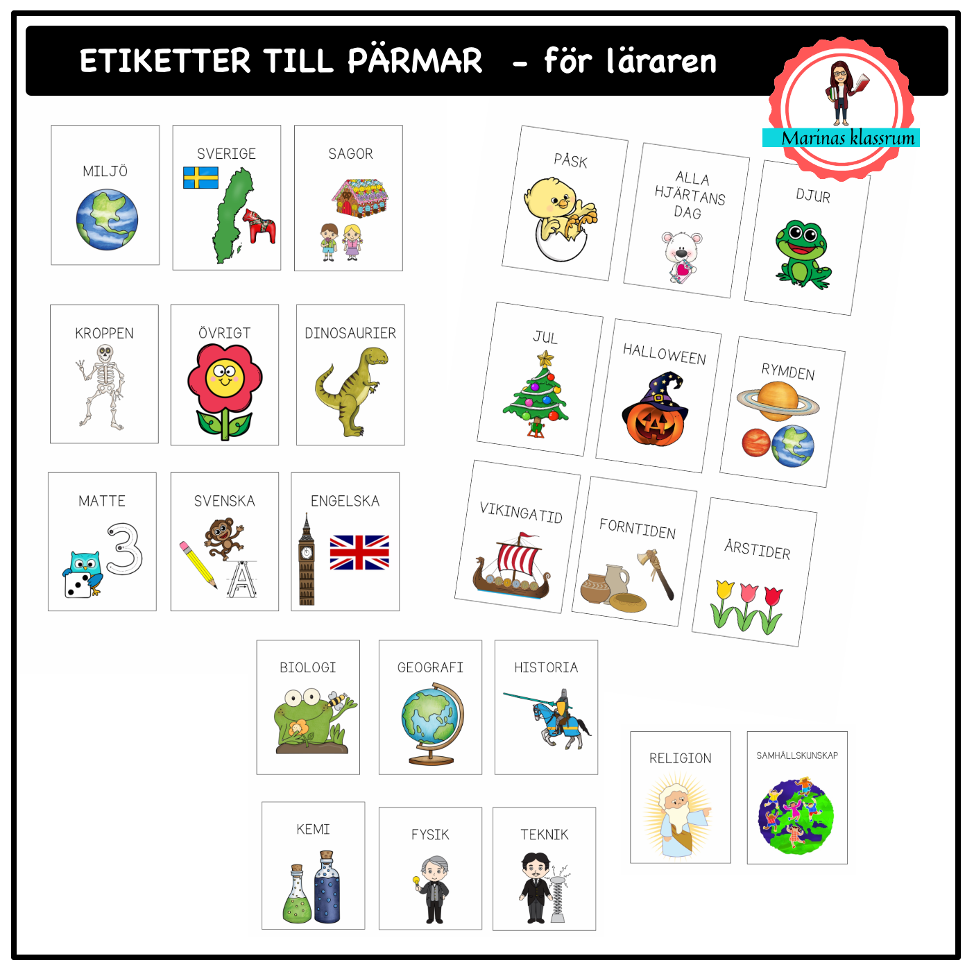 Olika etiketter att märka upp lärar-pärmar av modell "gaffel-pärm" större.
