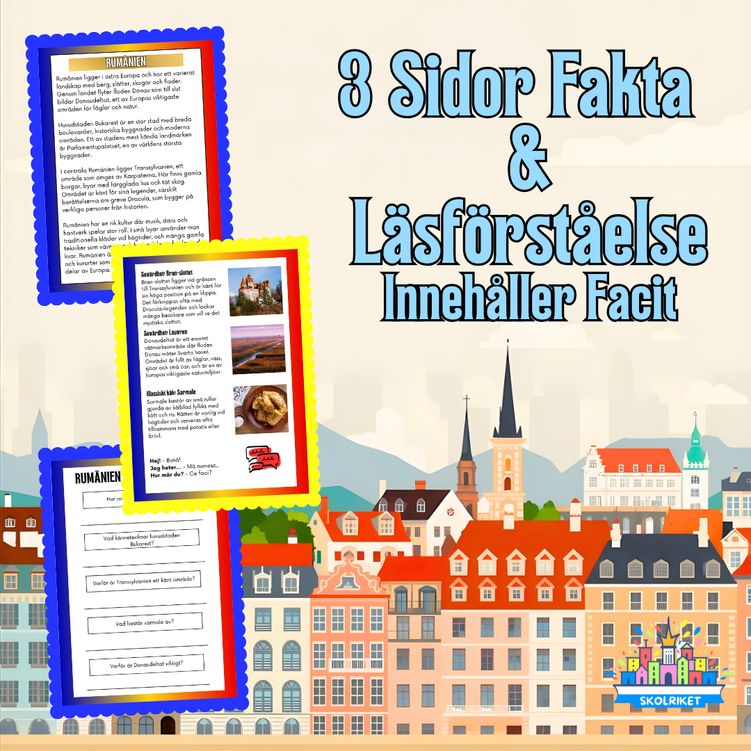 Upptäck Rumänien genom ett inspirerande faktablad med färgstarka bilder, karta, flagga och tydlig text. Materialet innehåller snabba fakta, information om kultur och geografi, samt ett arbetsblad med läsförståelsefrågor och facit.