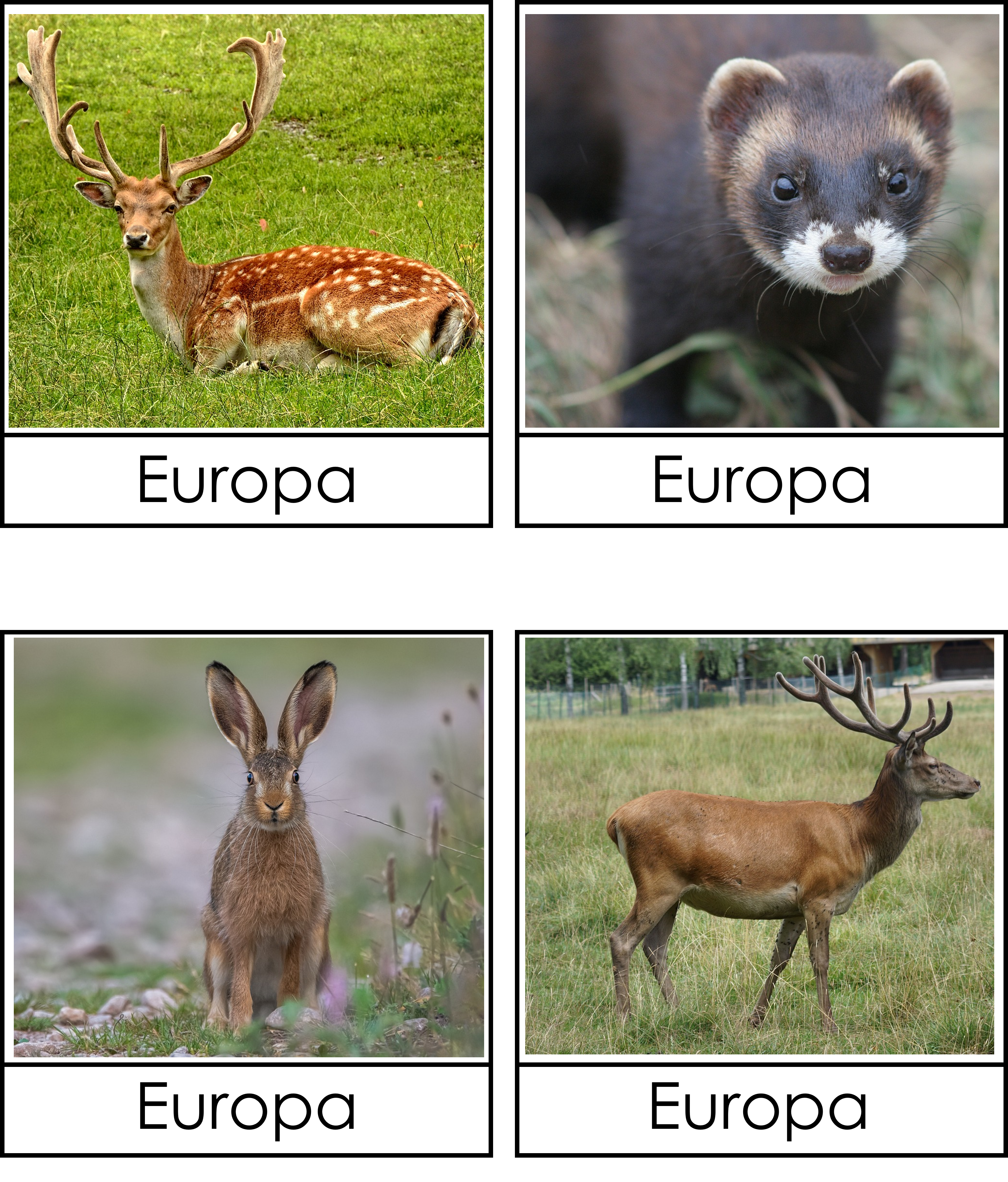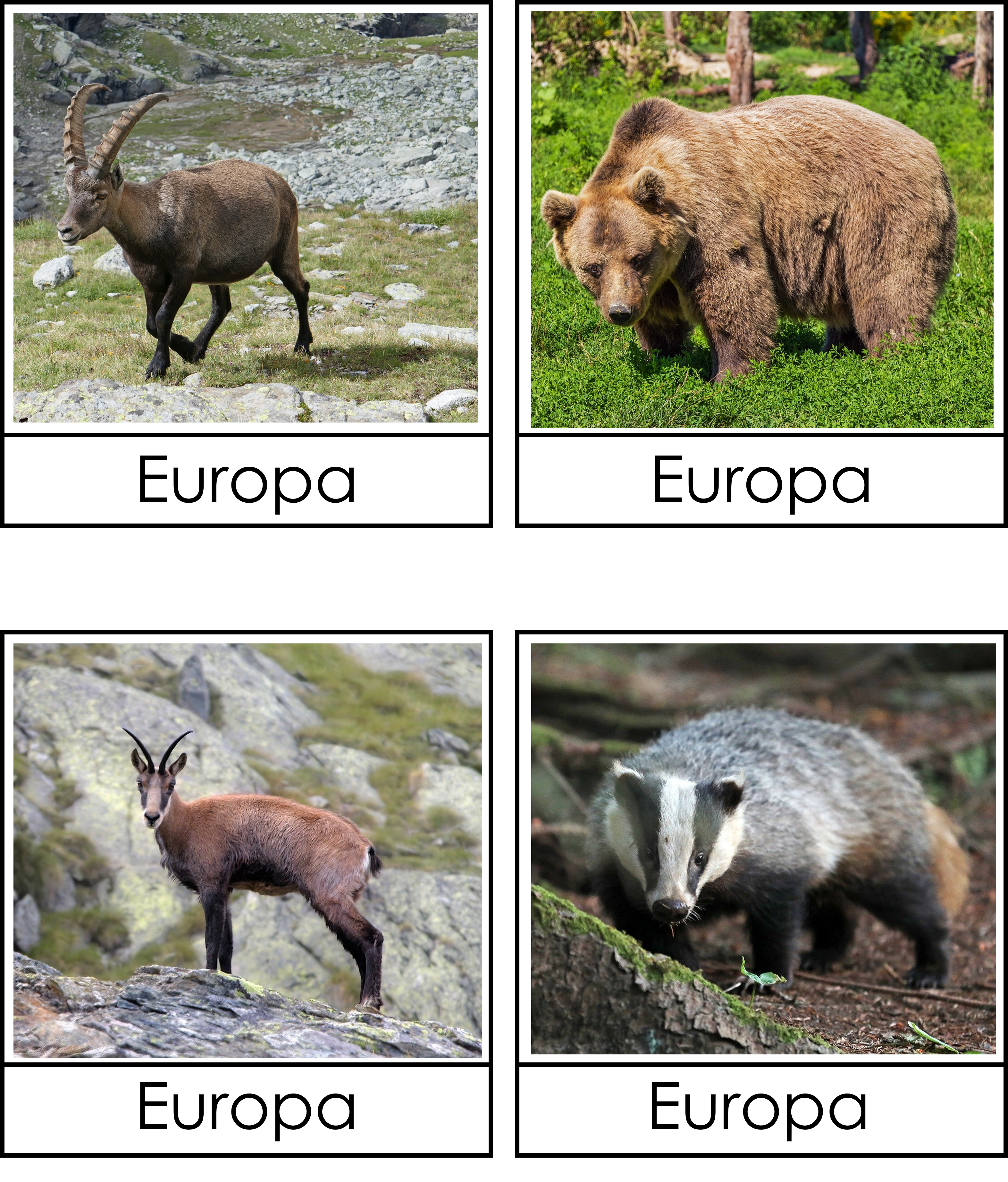Materialet innehåller 21 djurkort med djurets namn och 21 djurkort där det står Europa.