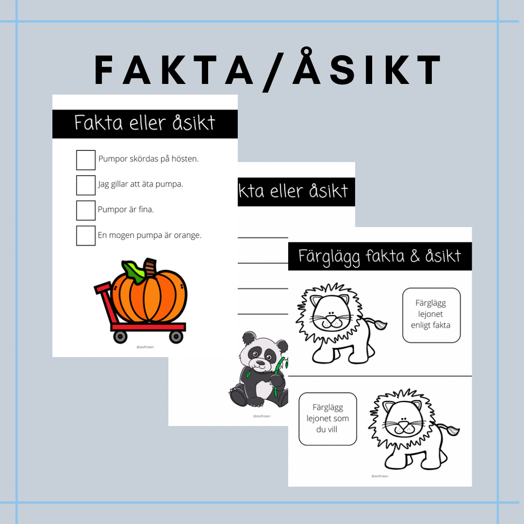 Ett paket innehållande ett häfte med tre olika uppgifter som handlar om skillnaden mellan åsikt och fakta. Kort där man ska placera vad som är en åsikt eller fakta samt planscher att sätta upp i klassrummet.