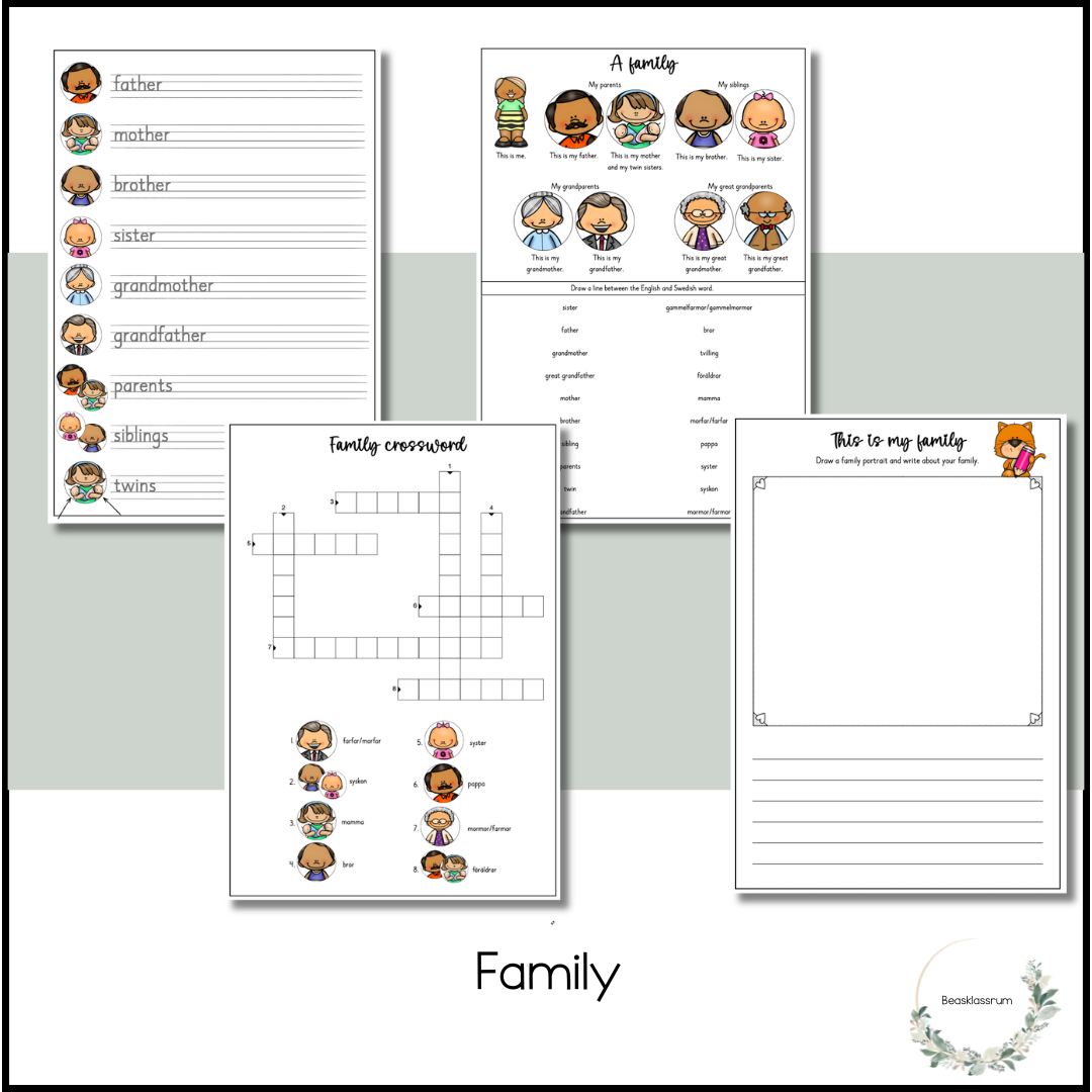 4 arbetsblad till tema "family" -välskrivning -dra streck ord/bild -korsord -rita din egen familj