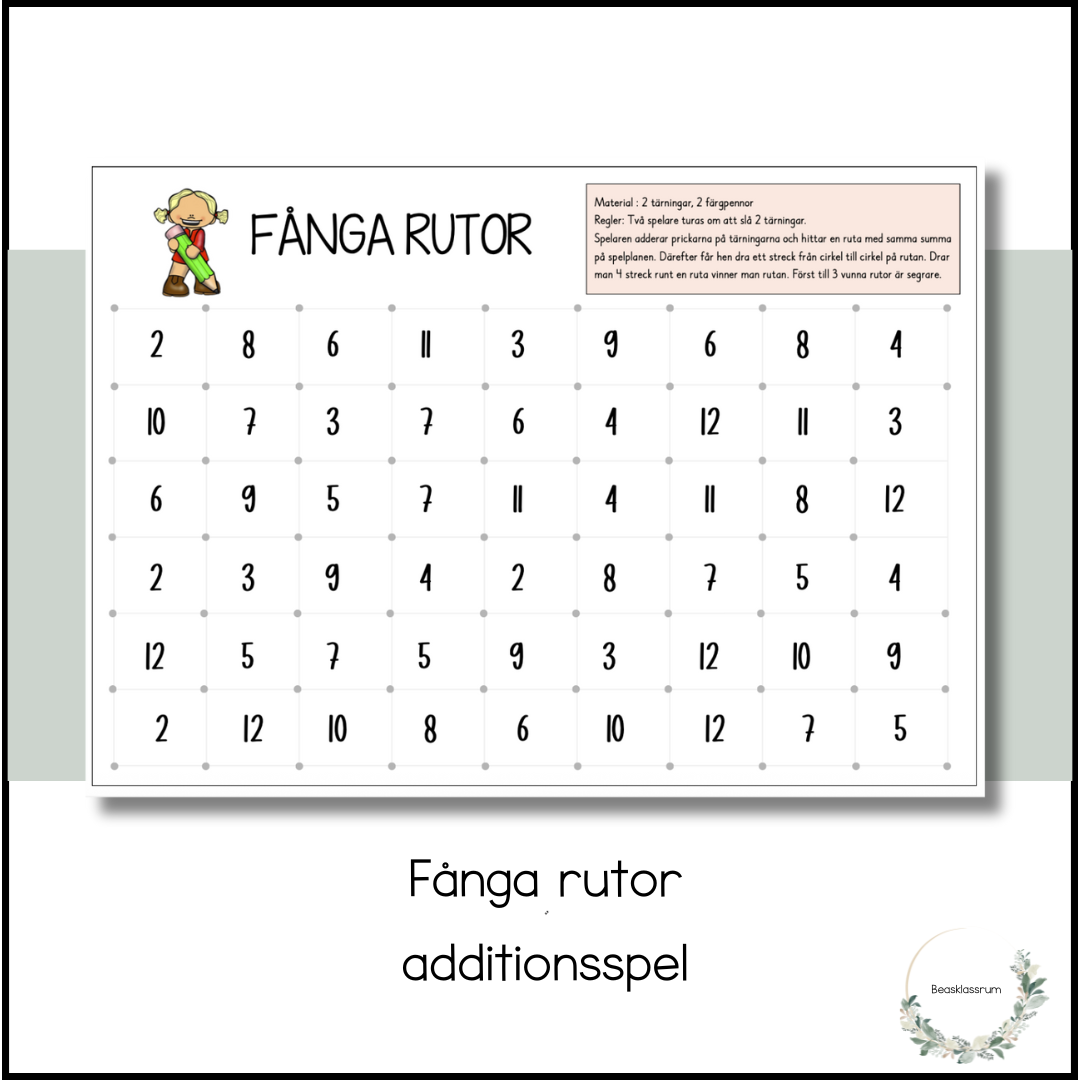 Eleven slår 2 tärningar och adderar antalet prickar. Eleven letar därefter upp en ruta med rätt tal och drar streck längs med en av rutans sidor. Först att ”fylla” 3 rutor med streck runtom vinner.