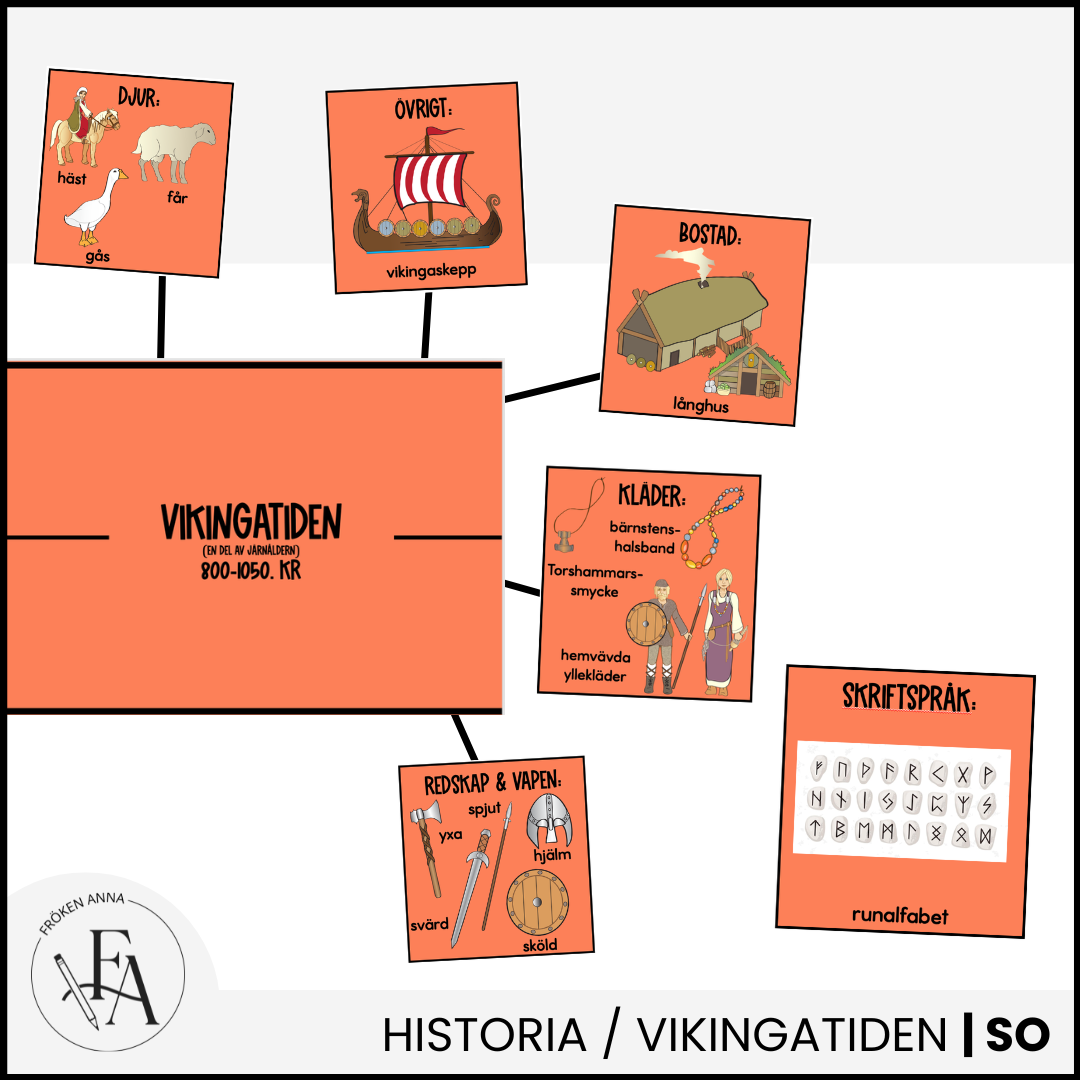 En färgkodad tidslinje med visuellt stöd och bilder som representerar tidstypisk(a) kläder, bostad, djur, mat/köksredskap samt redskap och vapen till tidsepoken vikingatiden. Sätt upp på väggen och använd en tråd / remsor och till de olika bilderna.
