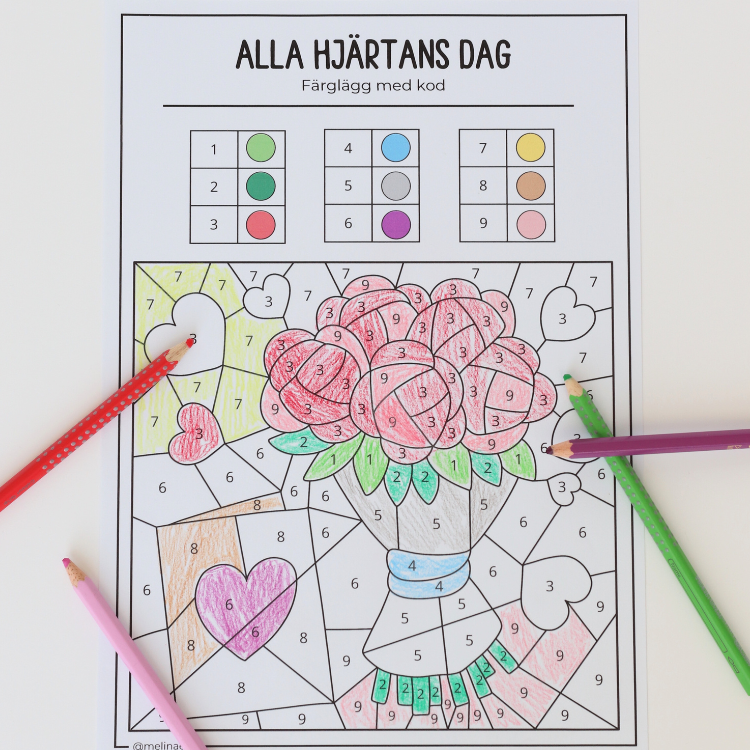 Färglägg bilder efter kod. Innehåller fem motiv att färglägga med tema alla hjärtans dag. Motiv: nalle med luftballong, hjärtlås med nyckel, rosor, muffins och kärleksbrev.