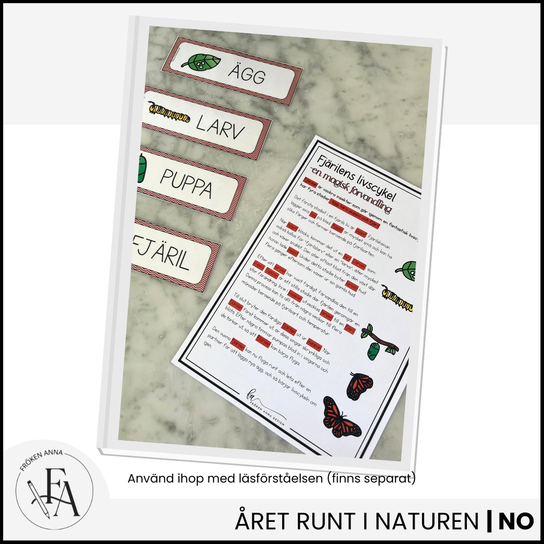 Ord- och bildkort över fjärilens livscykel. Sätt med fördel sedan upp bilderna på tavlan eller en vägg. Bild 2 är en inspirationsbild hur de kan användas till läsförståelsen om fjärilens livscykel.