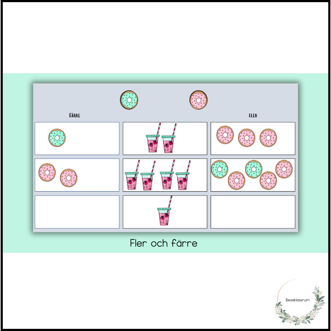 Träna fler och färre med donuts och smoothies. Eleverna flyttar donuts för att visa fler eller färre. Materialet är skapat i powerpoint.