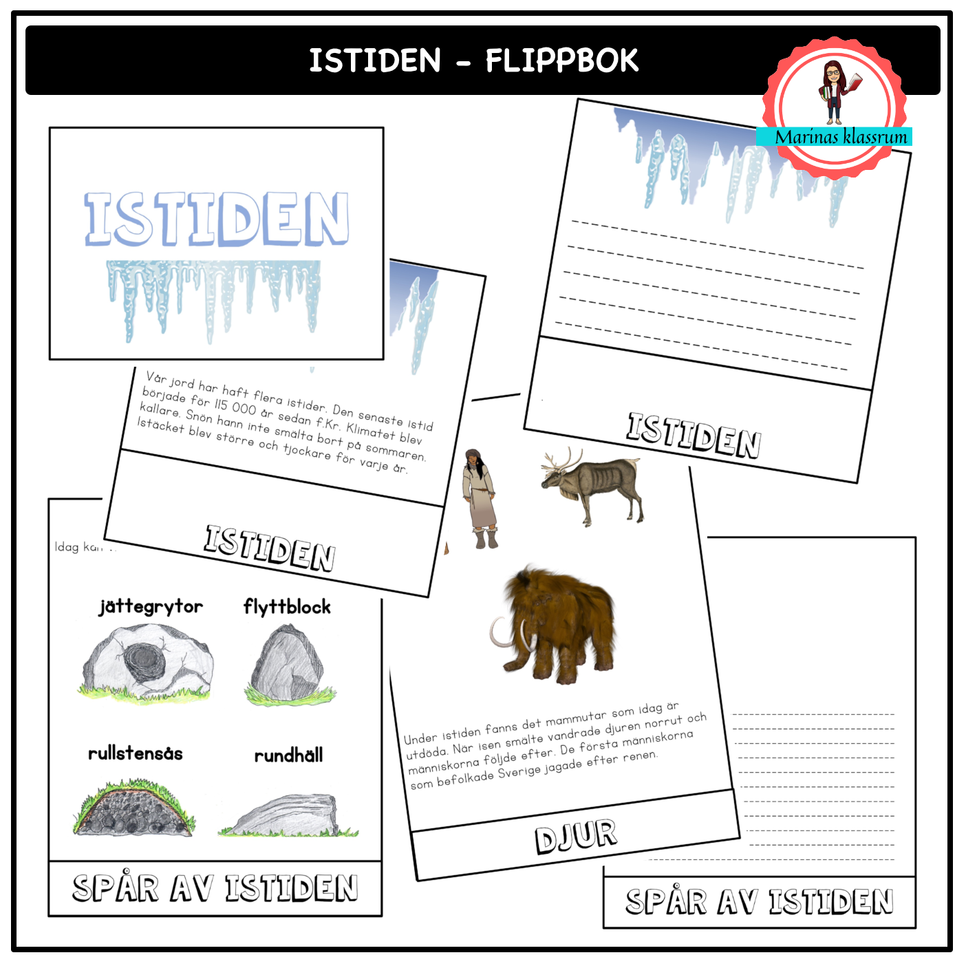 Material för eleverna att göra en egen flipp-bok om istiden. Följande flikar finns i flipp-boken: istiden, spår av isen, djur under istiden. Det ingår en färdig flipp-bok med texter som kan vara som inspiration till det egna skrivandet. Det finns två olika radavstånd att välja på och även en variant utan bilder i fall eleverna vill måla egen bilder.