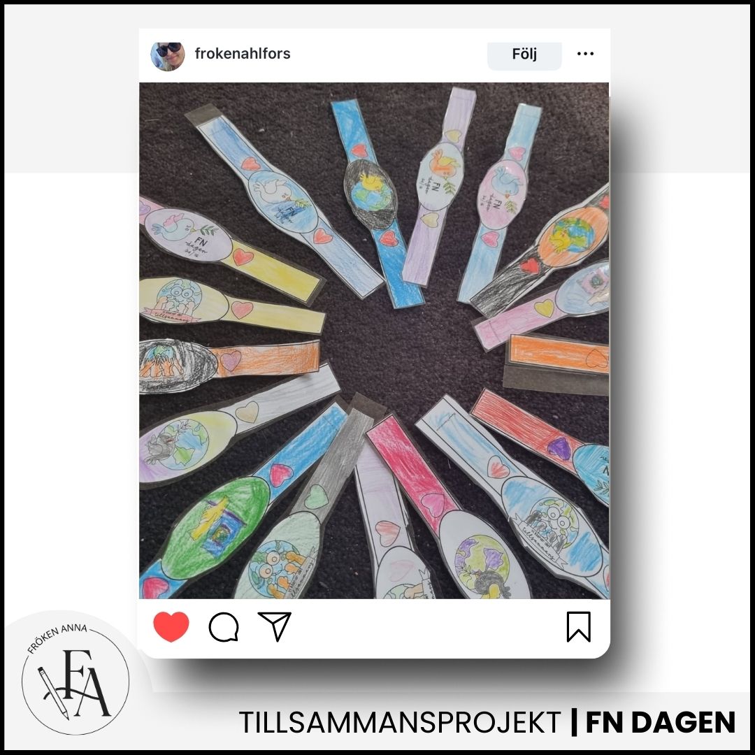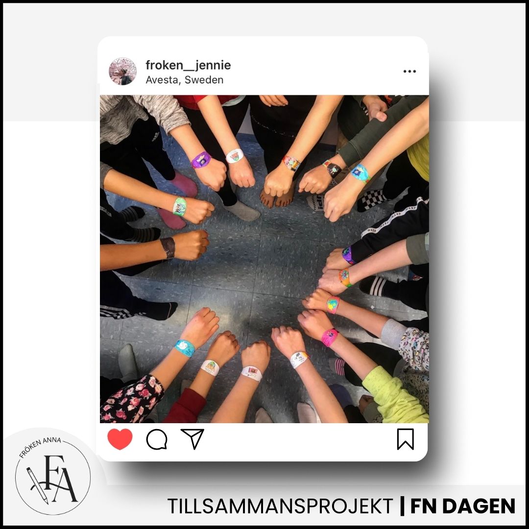 FN-armband med tillsammans-tema <3 Tips på arbetsupplägg: Låt barnen välja ett armband att färglägga och ta på sig runt handleden. Låt alla elever ställa sig i en ring och sträcka in armbanden i mitten. Ta ett foto på barnens händer och armband och sätt upp i klassrummet eller publicera i vecko-/månadsbrev eller kanske på klassens Instagram? Kommer bli en fin och symbolisk bild på hela klassen