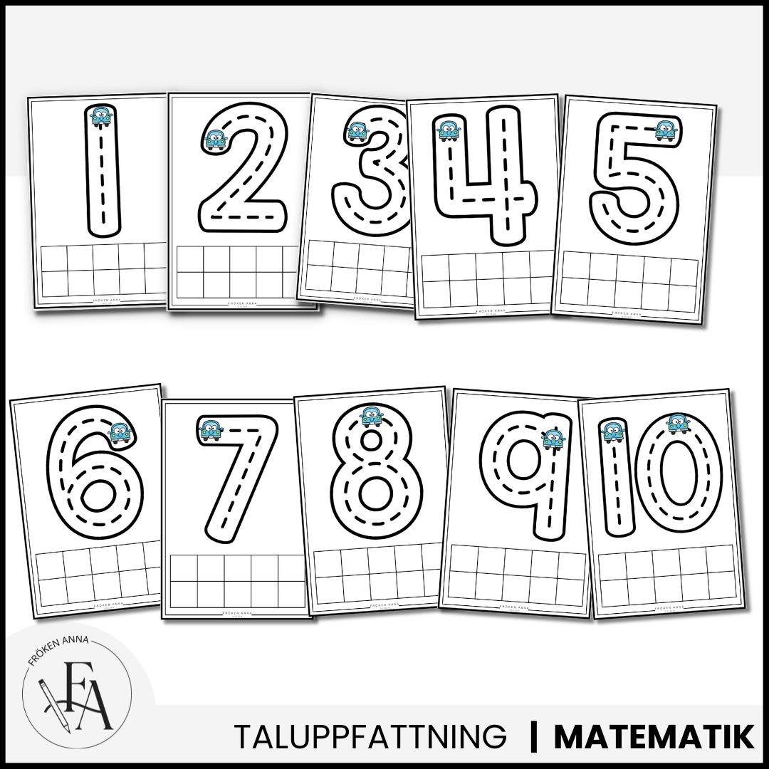 Dessaa pedagogiska blad kombinerar spårövningar med siffror och en räknedel som hjälper barnen att både lära sig siffrornas form och utveckla antalsuppfattning. Varje blad har en stor, tydlig siffra som barnet kan spåra med hjälp av en liten bil som följer siffrans konturer, vilket gör inlärningen både interaktiv och rolig.
