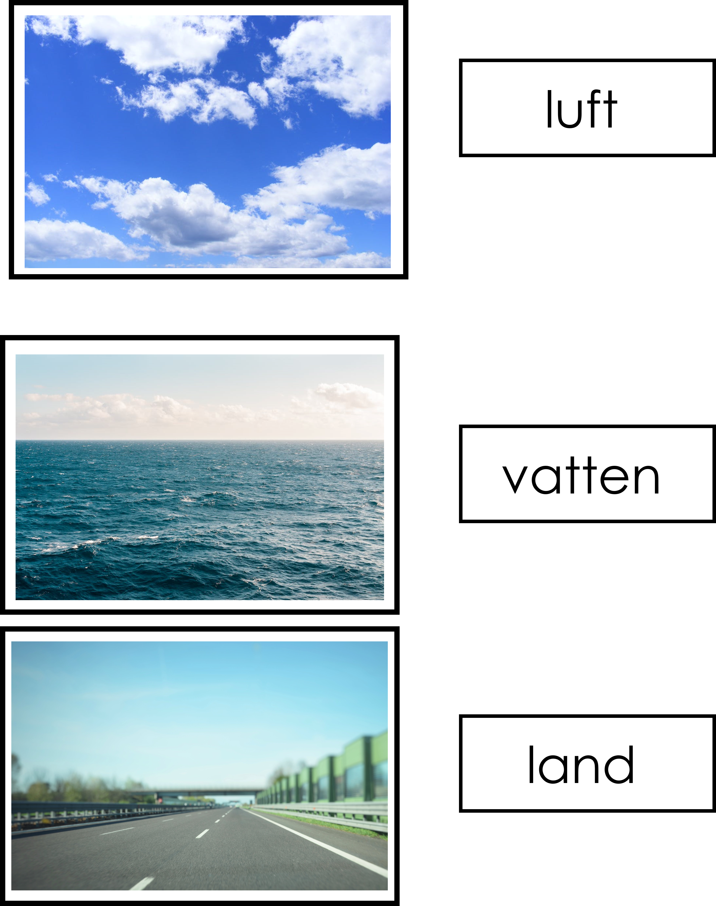 När man gör detta enligt Montessorimetoden så använder man 3 burkar där man har en som är land (som man lägger lite jord i) en som är vatten (som man häller lite vatten i) och en som är luft (där man blåser lite luft in i burken). Sedan ska barnet lägga rätt sorteringskort till rätt burk.