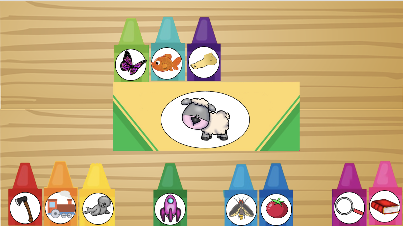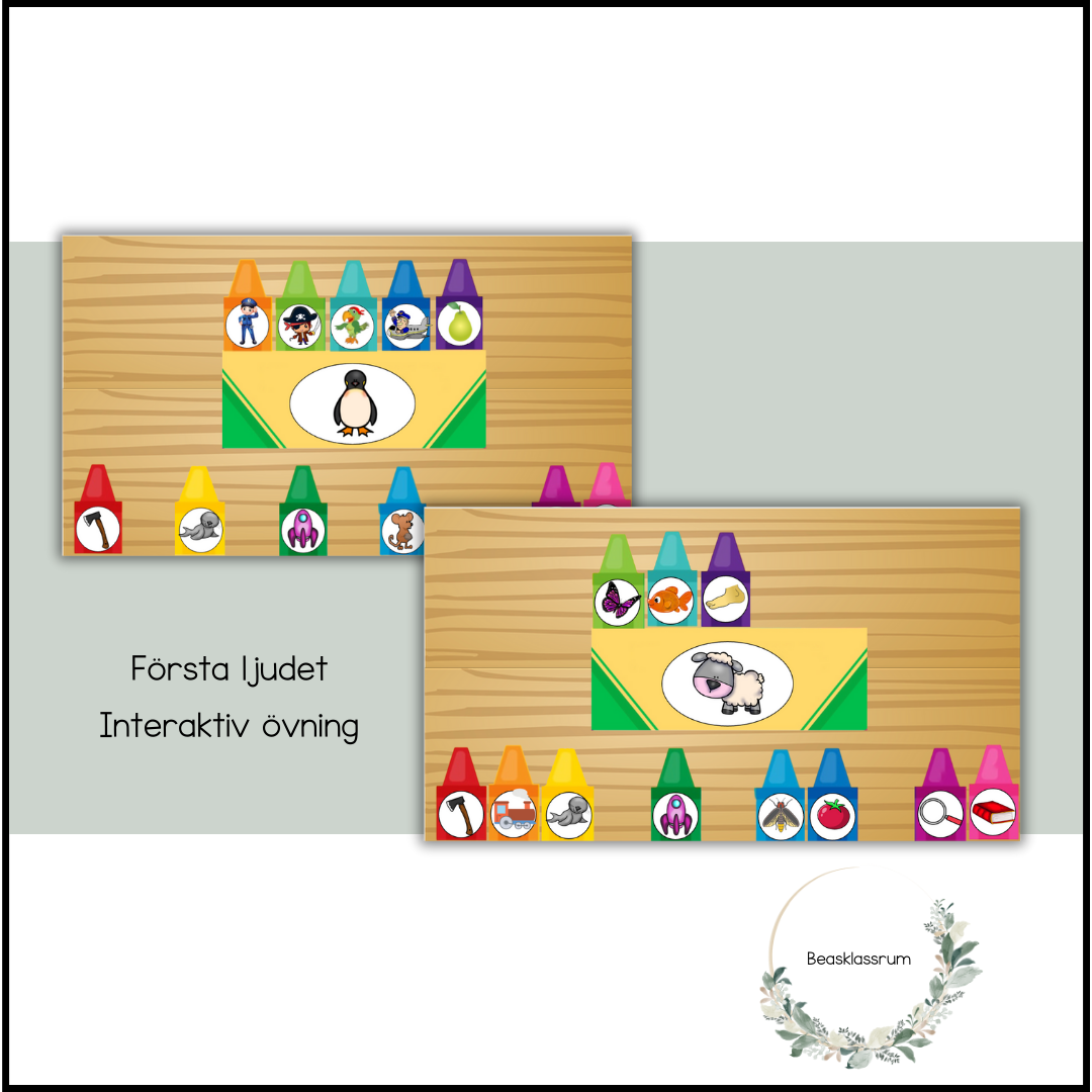 Interaktiv övning där eleverna får träna på första ljudet. Varje kritask ska innehålla 5 kritor som alla börjar på samma bokstav som motivet på kritasken. Alla bokstäver utom q,w,x,y,z finns med. Materialet är skapat i powerpoint.