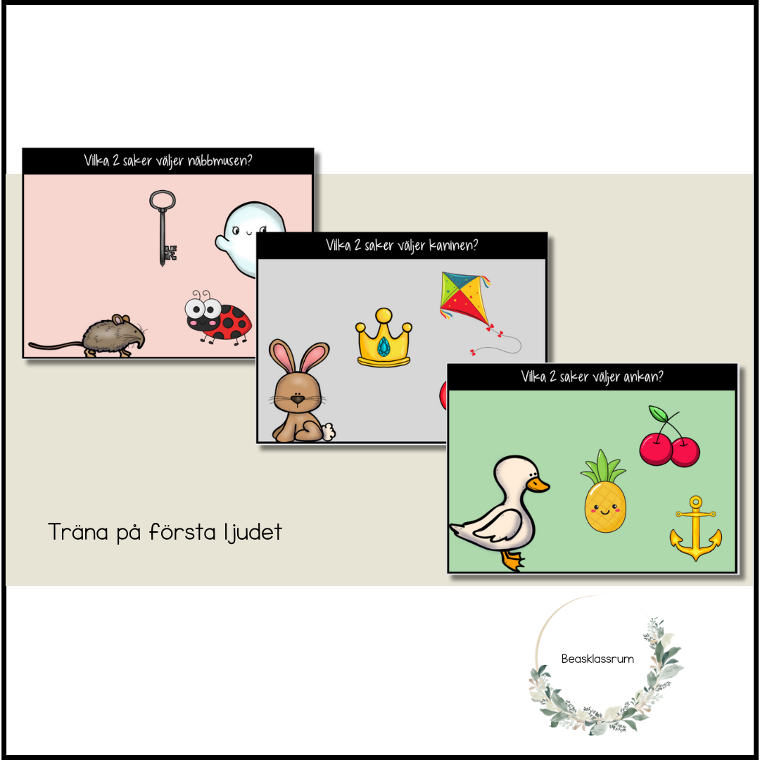Arbeta med första ljudet. Hjälp djuren att hitta de 2 föremål som efterfrågas. Finns inte till q, w, x Passar bra både som enskilt arbete där eleverna ringar in objekten och till gemensam genomgång på t.ex. smartboard.