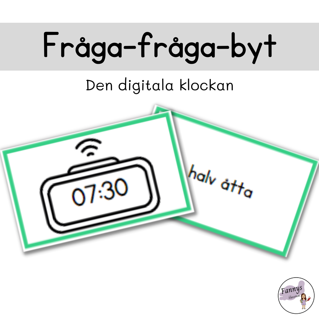 50 stycken fråga-fråga-byt med den digitala klockan. Skriv ut dubbelsidigt (vänd mot långsidan) för att få svaren på baksidan. Går även använda som memory genom att skriva ut ensidigt.
