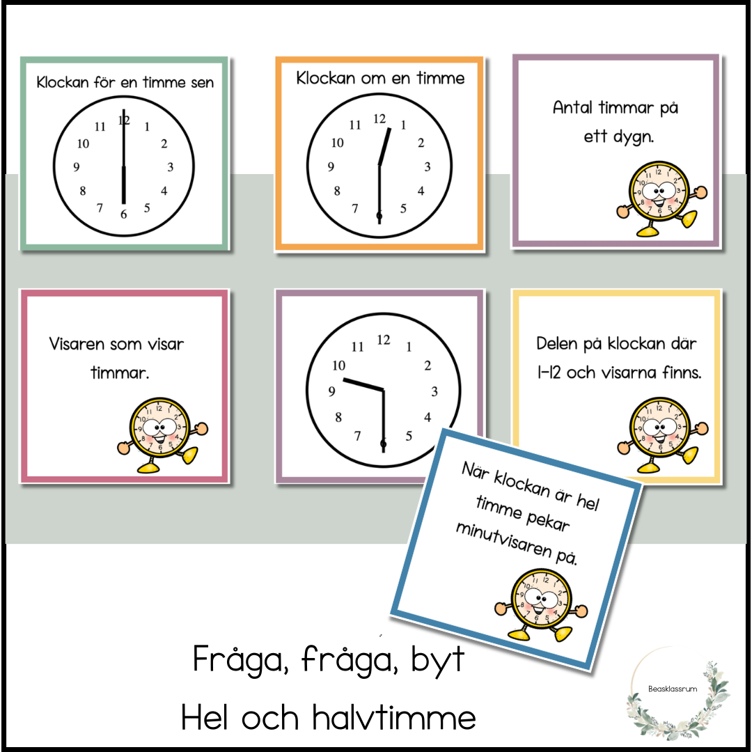 Fråga fråga byt - hel och halvtimmar 27 kort. Eleven tränar ord kring klockan, klockslag och mätning med tid.