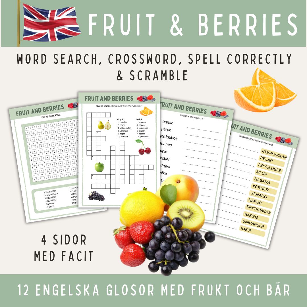 Frukt och bär, 12 glosor på engelska: ordsök, korsord, stava rätt & scramble 4 arbetsblad med facit. Kräver ingen förberedelse. Skriv ut och använd direkt.