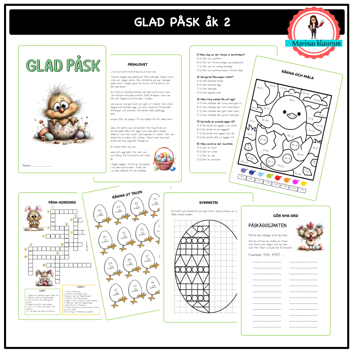 Ett arbetshäfte med blandade arbetsuppgifter i matematik och svenska med ett påsktema som passar åk 2. Totalt 12 sidor + framsida.