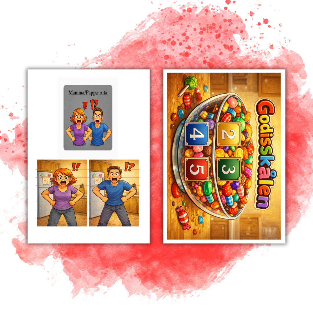 Godisskålen – nivå 3 är ett engagerande och lekfullt samarbetsspel där elever tränar bokstav–ljudkoppling och fonologisk medvetenhet samtidigt som de försöker tömma godisskålen innan mamma eller pappa upptäcker dem. Eleverna turas om att slå en tärning och ta godiskort från olika högar. Varje gång ett kort tas ska eleven säga ljudet till bokstaven högt, vilket stärker kopplingen mellan bokstav och ljud på ett aktivt och motiverande sätt. Spelet innehåller också ett spänningsmoment, varje gång en sexa slås läggs en del av mamma eller pappa ut på spelplanen. Om alla åtta delar byggs klart blir barnen upptäckta, men om eleverna lyckas tömma alla godiskort först vinner de tillsammans. I nivå 3 tränas bokstäverna Y, T, G, Ö, P, D, X, Z, C, Q och W, vilket gör spelet lämpligt när eleverna arbetar vidare med mer ovanliga bokstäver och ljud i alfabetet. Spelet uppmuntrar samarbete, turtagning och aktiv språkträning och kan enkelt anpassas genom att justera antalet kort i högarna. Materialet innehåller spelplan, godiskort, mamma/pappa-delar och tydliga instruktioner, vilket gör det lätt att använda direkt i klassrummet.