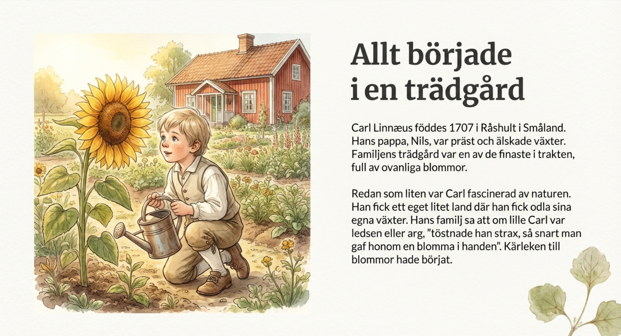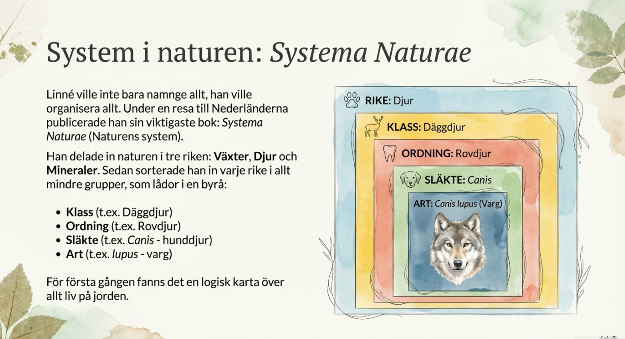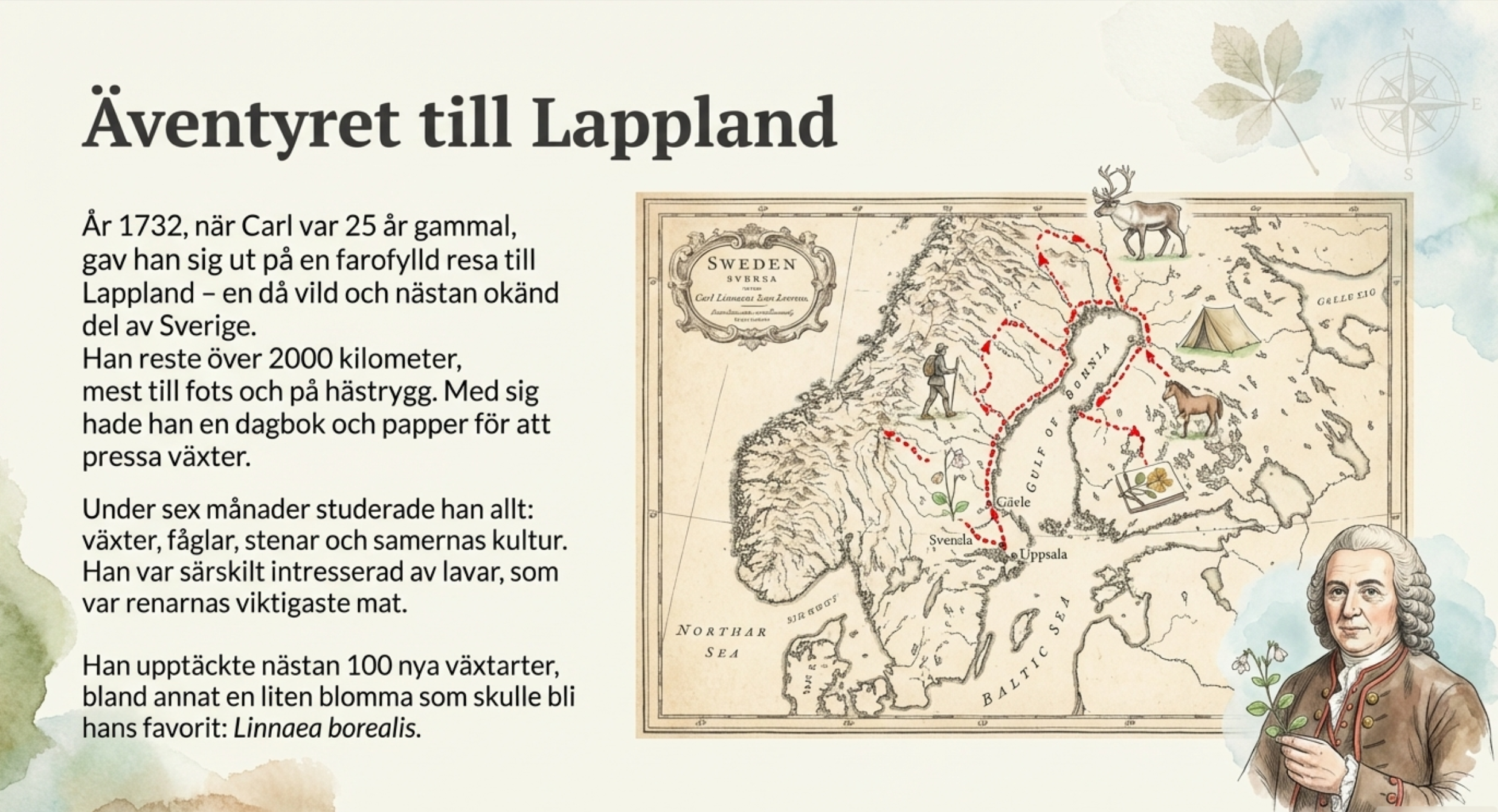 Carl von Linné var en världskänd svensk naturforskare och läkare som lade grunden för hur vi än idag namnger och grupperar växter och djur. Han skapade ett system där varje art fick ett vetenskapligt namn på latin bestående av två delar, som till exempel Homo sapiens för människan. Under sin karriär som professor i Uppsala genomförde han flera berömda resor genom Sverige för att kartlägga landets naturtillgångar och växter. Linné kallas ofta för ”blomsterkungen” och hans arbete revolutionerade biologin genom att skapa ordning och reda i naturens stora mångfald.