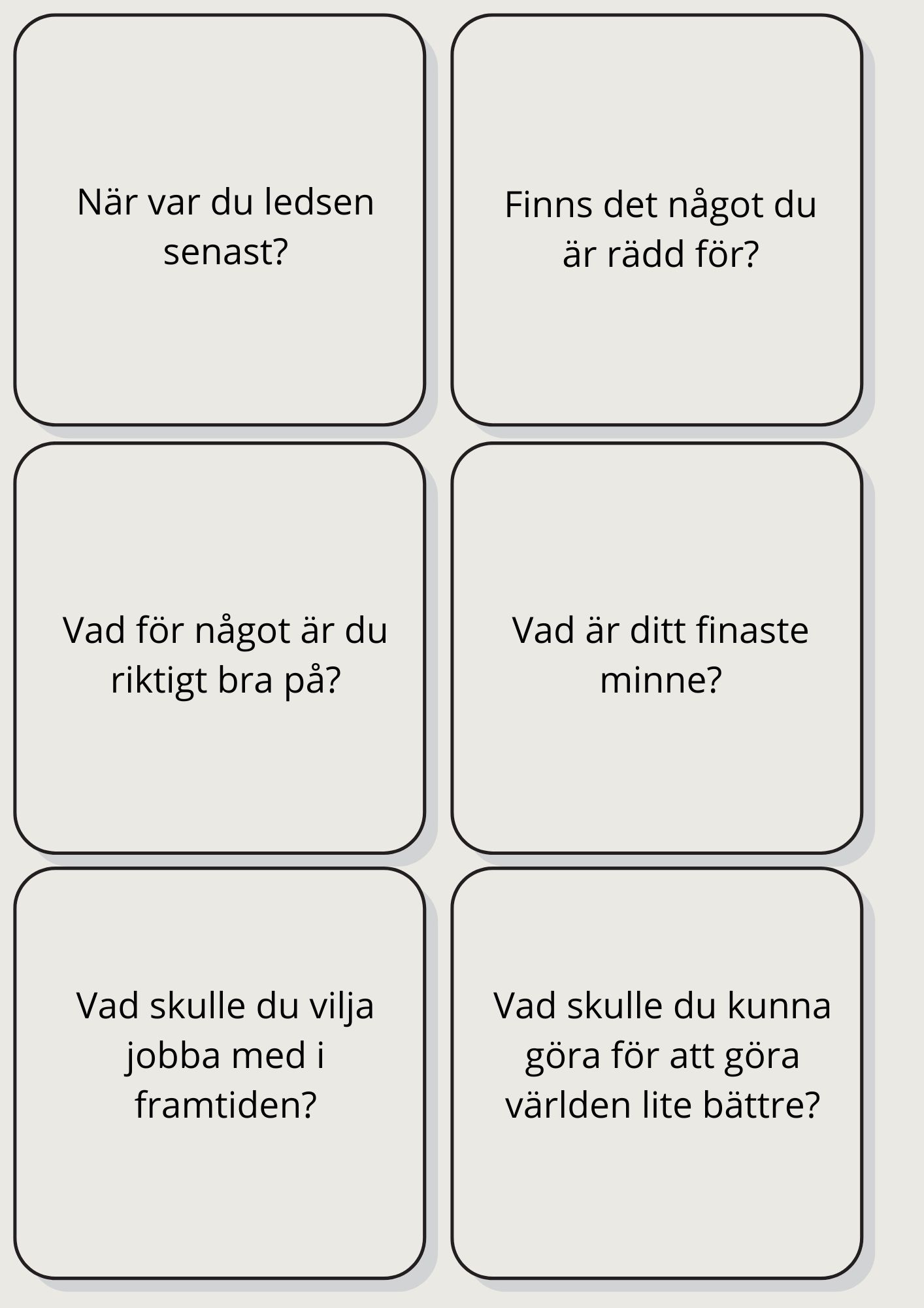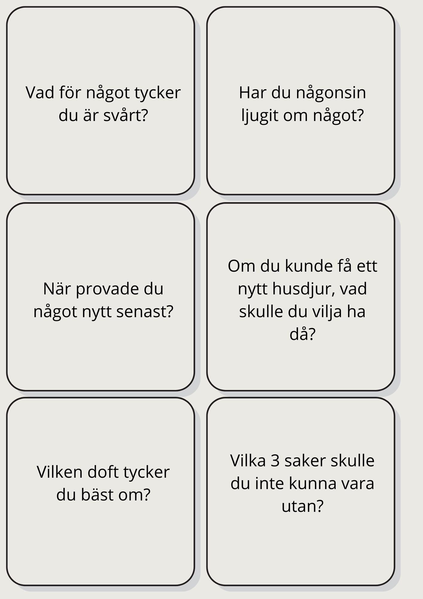 Lär känna dina vänner eller klasskompisar med roliga och utmanande frågor om er själva.