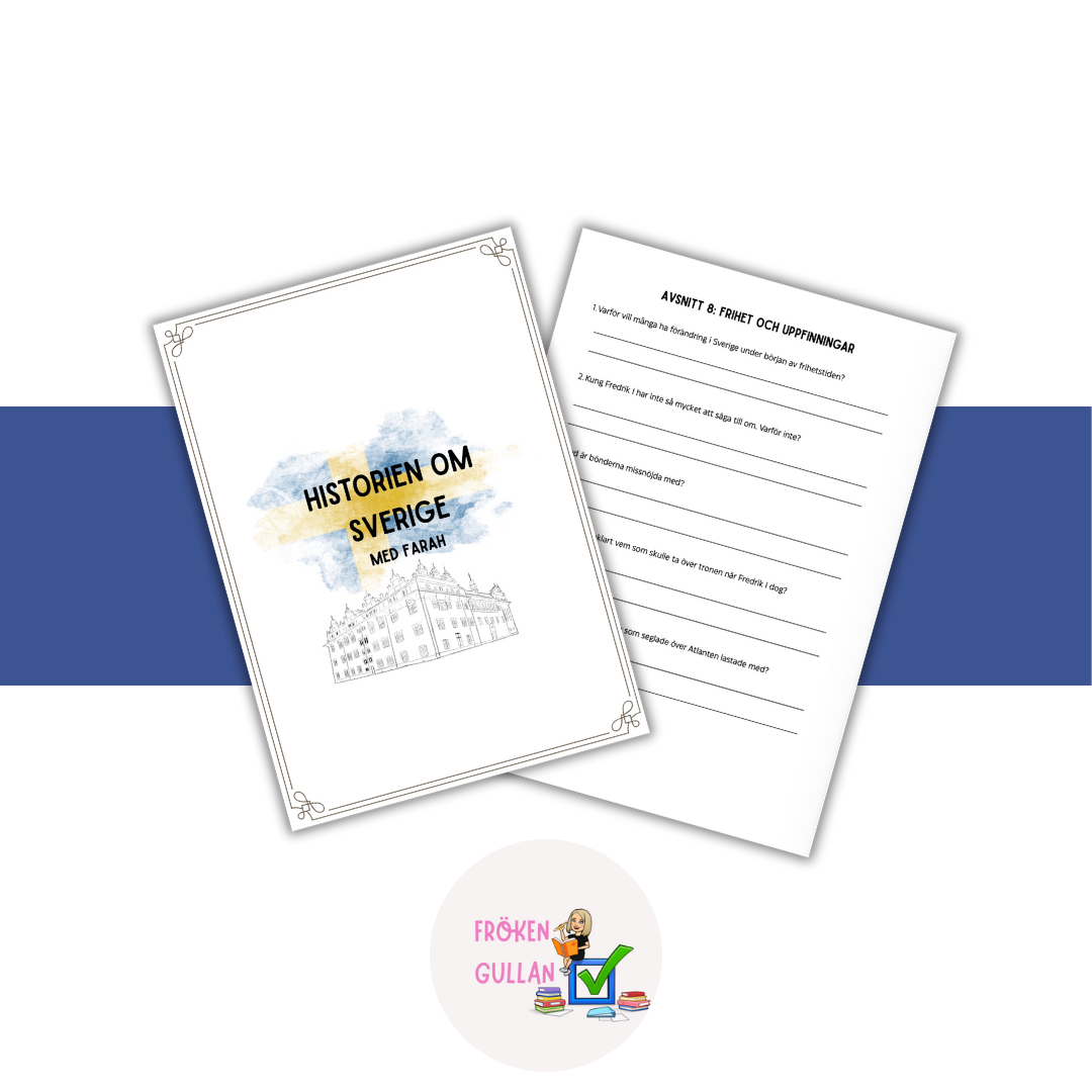 Ett arbetsblad kopplat till avsnitt 8 av Historien om Sverige med Farah på SVT. Arbetsbladet innehåller 10 frågor kopplade till avsnittet om frihetstiden och uppfinningar. I filen finns en framsida sam två A4-sidor med frågor.