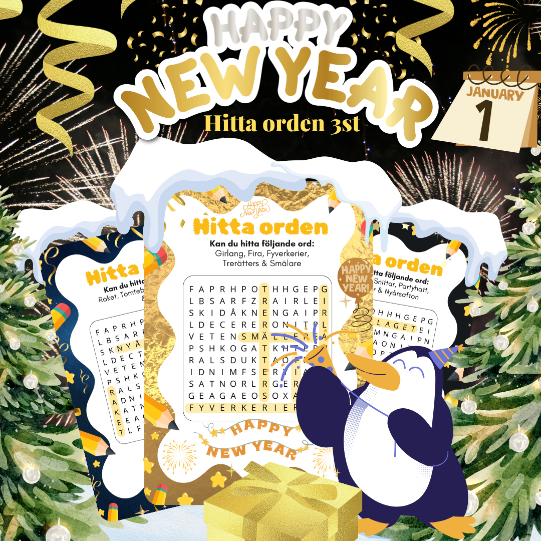 Denna pdf innehåller 3st hitta orden på svenska. Eleverna ska hitta de gömda orden på temat Nyår bland alla bokstäver. Laminera och de kan återanvändas. Facit medföljer.