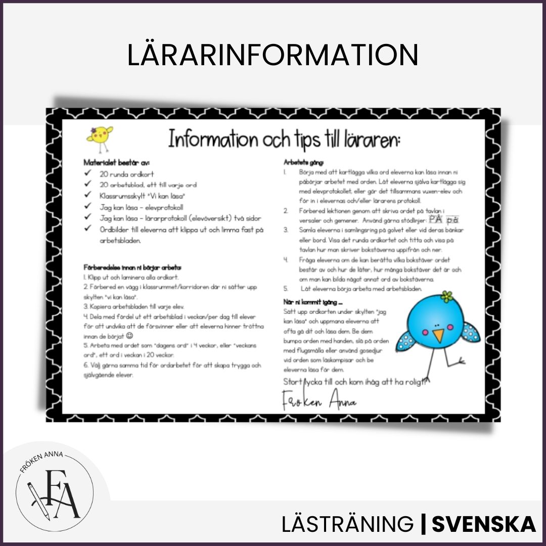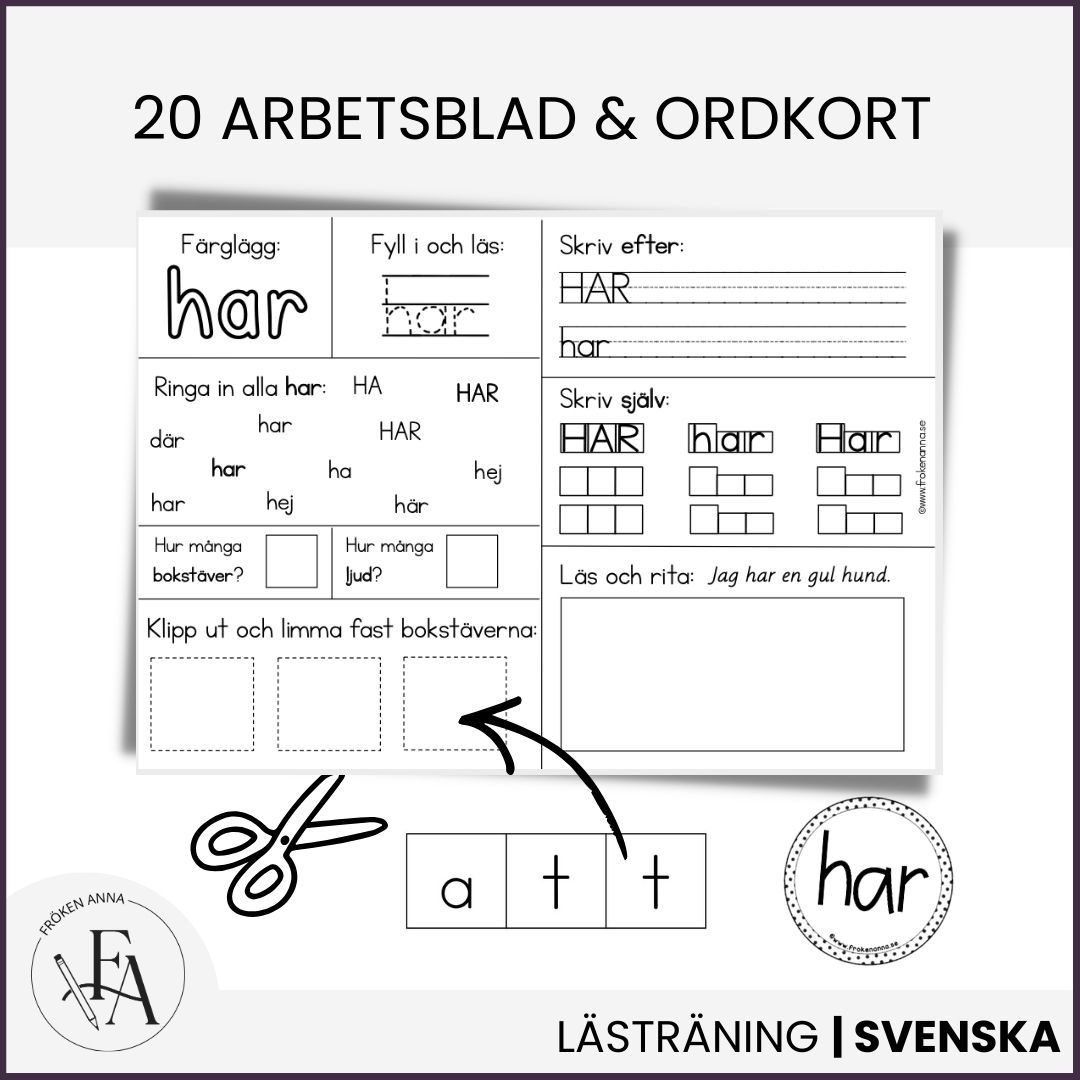 Eleverna arbetar med 20 högfrekventa ord som består av tre bokstäver genom tydliga och återkommande arbetsblad. Den igenkännbara strukturen gör det lätt för eleverna att fokusera på ordet och bygga upp säkerhet över tid. Materialet lämpar sig väl för att introducera ett ord i taget, till exempel ett ord per vecka, och följa elevernas progression.