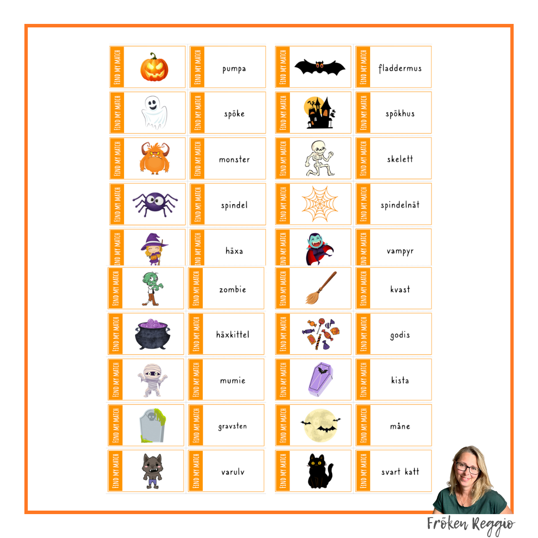 Kort med text och bilder för att göra rutinen ”Hör vi ihop”. 20 olika halloweenord med bild och namn på ordet. Materialet finns också på engelska.