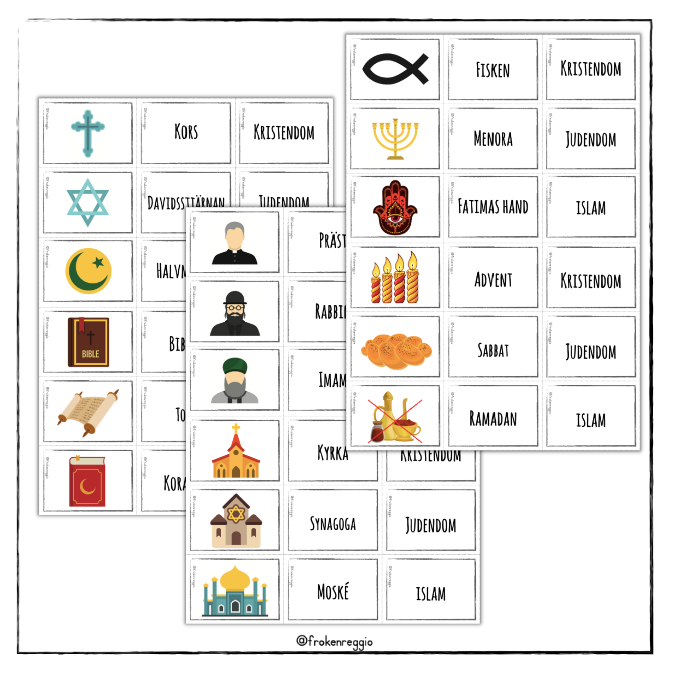 18 x 3 kort för att göra rutinen "Hör vi ihop" med de tre abrahamitiska religionernas kännetecken.